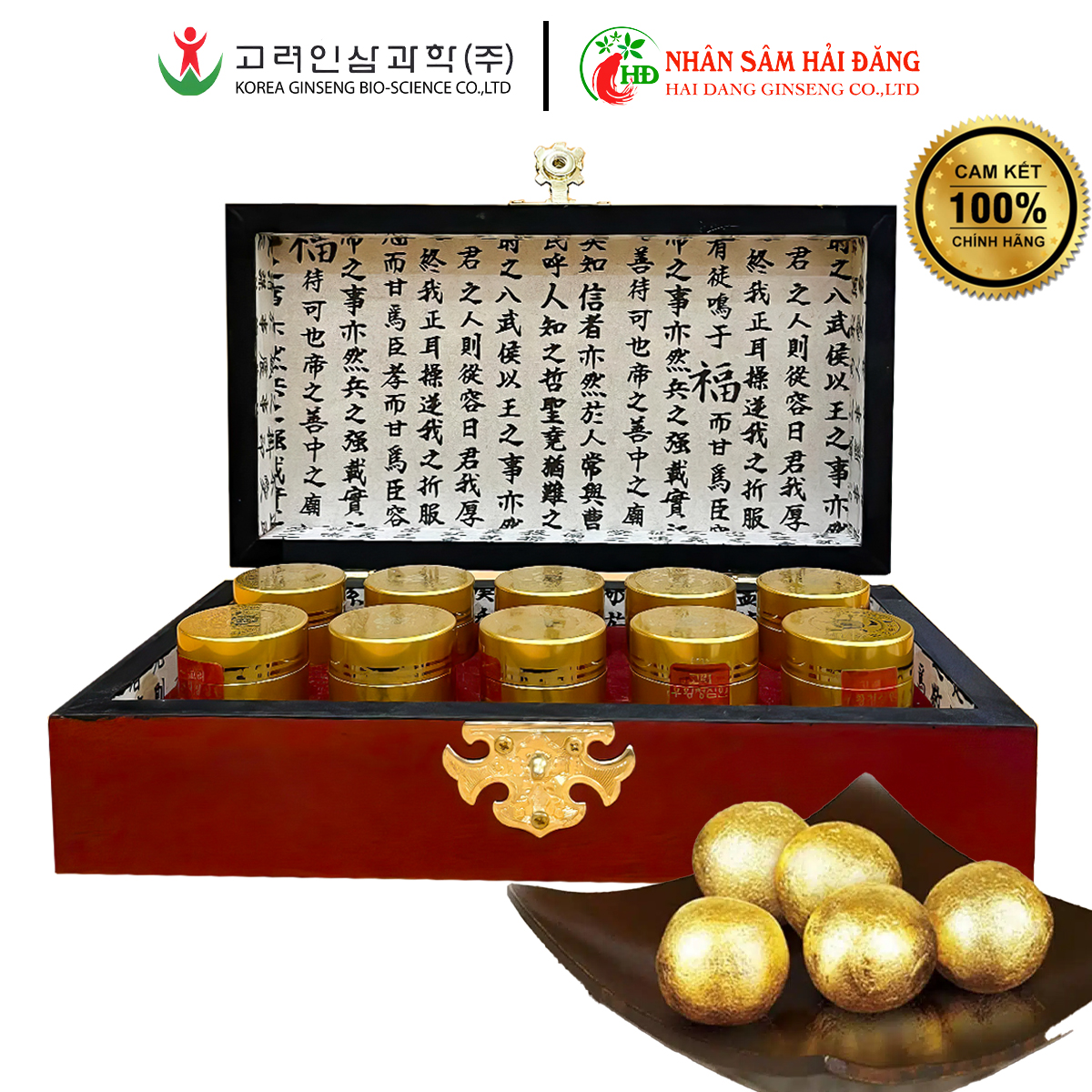 Quy Cách: hộp gỗ 10 viênXuất Xứ: Hàn QuốcThành Phần:Chiết xuất: Nhân sâm 112mg, Cam thảo 225mg, Sơn dược 322mg, Da cừu 79mg, Đương quy 71mg, Quả mơ 72mg, Mẫu đơn trắng 72mg, Mạch môn 72mg, Hoàng cầ...