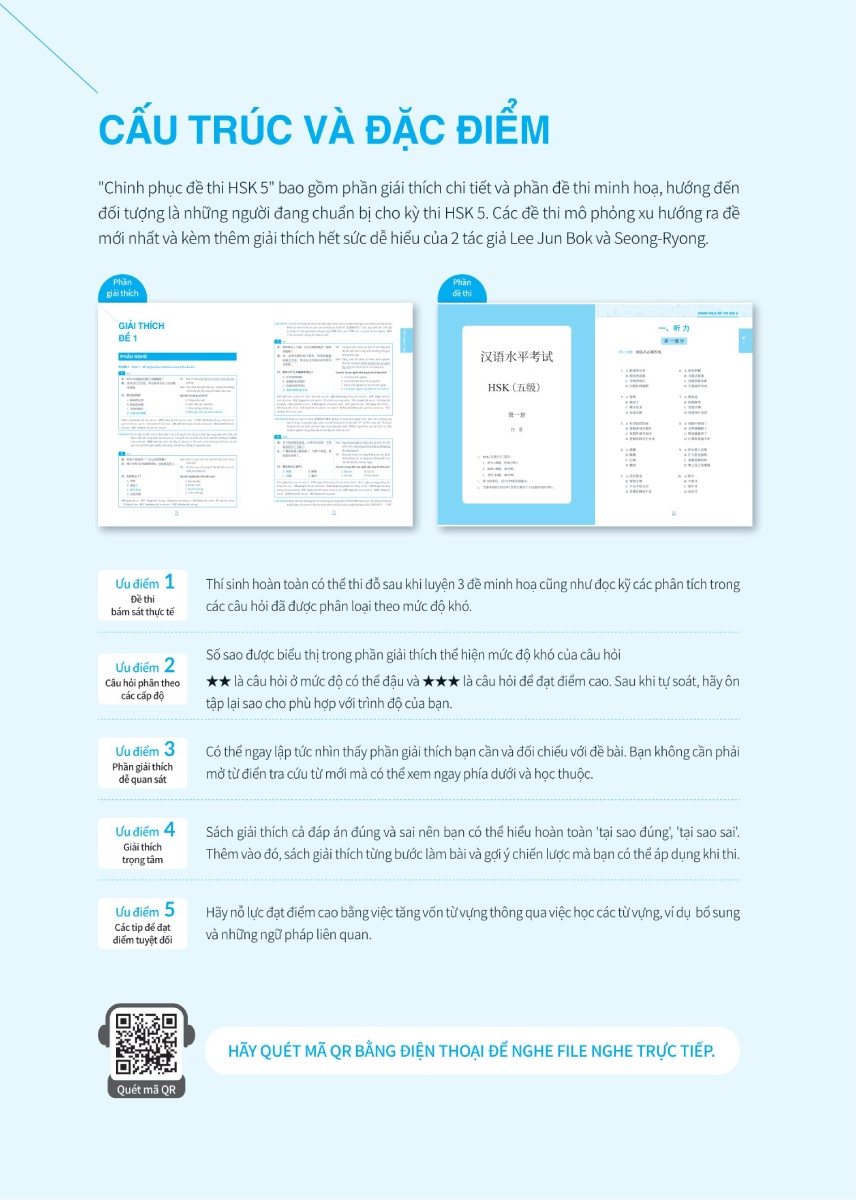 Cuốn sách "Chinh phục đề thi HSK 5" được tổng hợp với 3 bài thi thử, phân tích các câu hỏi được đưa ra trong bài thi HSK gần đây và chọn ra những câu hỏi trọng tâm. Bên cạnh đó cuốn sách cũng giải thích chi tiết các kiến thức cốt lõi trong các đề thi gần nhất với đề thi thật cũng như các câu hỏi học sinh dễ mắc lỗi.