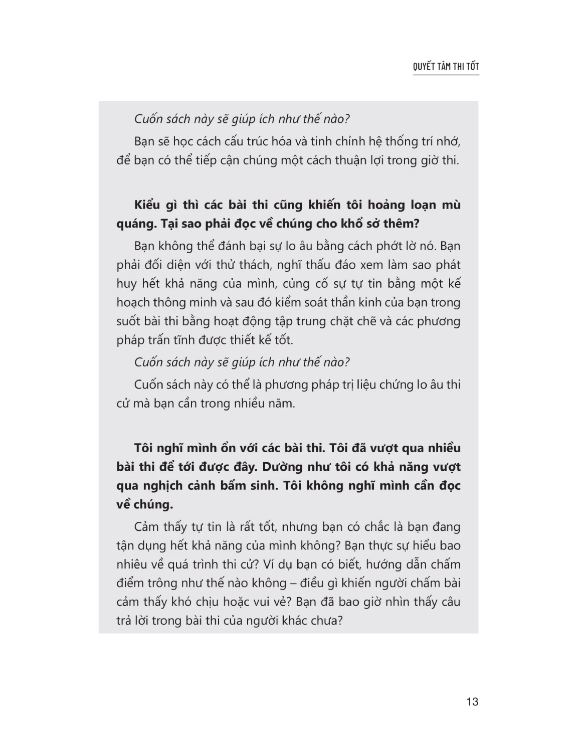 - Các bài thi thực ra không... đáng sợ đến thế! Các bài thi đóng một vai trò quan trọng trong cuộc sống của nhiều người - định hình trải nghiệm tuổi trẻ, cũng như khát vọng và triển vọng. Vậy mà, mặc cho tất cả sự hiện diện to lớn nhưng mờ ảo và ý nghĩa cá nhân của chúng, ta không thực sự hiểu rõ các bài thi hay biết cách hòa mình vào chúng một cách xây dựng và hữu dụng. Thực ra, các bài thi không bí ẩn hay đáng sợ như vẻ ngoài của chúng. Ta có thể thấu hiểu và hòa mình, thậm chí tận hưởng các bài thi, khi đã làm chủ và tận dụng được chúng.