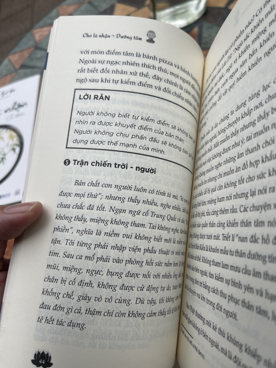 Bằng những câu chuyện kể với giọng văn nhẹ nhàng, những triết lý nhân sinh gần gũi với cuộc sống đời thường, cuốn sách “Cho là nhận: Dưỡng tâm" mang đến cho mỗi người những trải nghiệm quý báu để xây dựng cho mình một cuộc sống thật bình yên và hạnh phúc từ chính tâm trí. Suốt cuộc đời, ta cứ mãi rong ruổi chạy theo những giá trị vật chất bình thường mà quên đi còn vô số những giá trị khác nữa song hành. Một khi con người ta biết đủ thì mọi thiếu thốn về vật chất cũng chính là một sự sung túc trong tâm thức của mình. Một khi tâm con người ta không còn sân si thì đó chính là lúc trái tim mình luôn giàu có tình thương yêu vô bờ bến. Cuốn sách là cẩm nang vàng cho chặng đường đời mỗi người để không bị bấp bênh, lạc lối, áp lực cuộc sống đè nặng. Ai trong chúng ta cũng đều phải trải qua thời khắc gian nan hay mất phương hướng, nhưng chỉ cần tiết chế tham sân si của bản thân, trở lại với bản ngã và lấy lại tâm thế, thì có thể tìm thấy hạnh phúc trong từng phút giây và hơi thở cuộc sống.