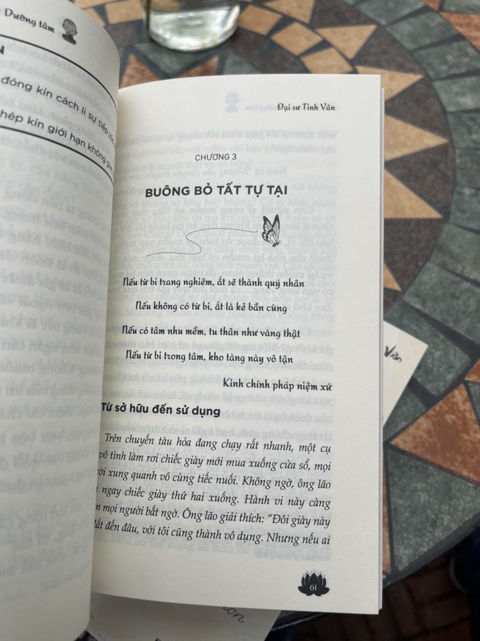 Cuộc sống quanh ta đầy màu nhiệm, chánh niệm là trái tim của thiền tập, là nguồn năng lượng xuyên suốt không thể thay đổi. Một người sống trong chánh niệm, tâm an, sẽ khiến những người xung quanh vui vẻ, an nhiên và thậm chí thay đổi cả xã hội. “Tất cả chúng ta đều có hạt giống của niệm và định” “Định làm phát sinh hỷ lạc” Định nguồn căn, có định con người sẽ cảm thấy đang thực sự sống chứ không phải chỉ tồn tại. Cảm nhận cuộc đời tươi đẹp không qua đôi mắt mà qua hơi thở và tâm hồn. Thiền sư Lâm Tế đã nói rằng: “Phép lạ là đi trên mặt đất mà không phải đi trên mặt nước hay đi trên than hồng”. Tất cả những gì ta làm đều cốt yếu là để tâm an. Mỗi ngày, ta đì tìm tự do cho hạnh phúc, hay hạnh phúc để được tự do?! Nếu cứ mải mê mắc kẹt trong quá khứ và lo buồn về tương lai, hiện tại sẽ tự nhiên ngả màu héo úa. Nghỉ ngơi là bước đầu tiên của thiền tập, và con đường ngắn nhất là thả lỏng và không gượng ép. Sống là để không uổng phí một đời, sống trọn vẹn từng giây phút, thanh thản từng hành động. Bước đi một cách thoải mái, an lạc, đi như không đi sẽ không thấy mệt mỏi. Sự cố gượng là không cần thiết nếu ta hiểu được rằng mỗi bước đi là mỗi bước được tiếp xúc với cuộc đời và sự màu nhiệm vô tận. Chạm vào đất Mẹ là nguồn căn của “Sám Pháp địa xúc”, người thường cũng có thể thực hành khi bế tắc, lo sợ, Người nhẫn nại bảo hộ, che chở và cho ta lối thoát, mọi thứ tự khắc trở nên nhẹ nhàng. Cuốn sách tiếp tục với Năm uẩn trong một con người: sắc, thọ, tưởng, hành, thức, đều cần trị vì, cai quản. Có chánh niệm sẽ nhận diện được