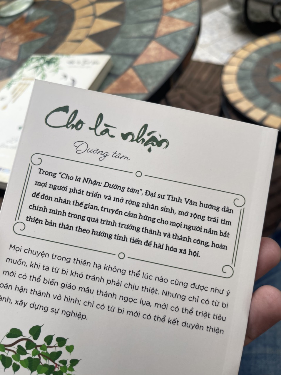 Một cuốn sách lưu giữ những bí mật để đạt tới hạnh phúc, buông bỏ sân hận đạt đến cảnh giới khoái lạc trong đời sống. 124 Trang sách trong “Cho là Nhận: Dưỡng tâm", Đại sư Tinh Vân hướng dẫn mọi người phát triển và mở rộng nhân sinh, mở rộng trái tim để đón nhận thế gian, truyền cảm hứng mỗi người nắm bắt chính mình trong quá trình trưởng thành và thành công, hoàn thiện bản thân theo hướng tịnh tiến để hài hoà xã hội.