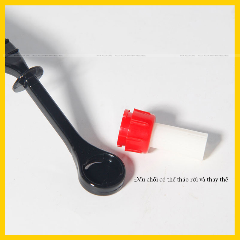 Với dụng cụ chổi cọ vệ sinh, bạn có thể định lượng hóa chất vệ sinh máy bằng muỗng ở 1 đầu cọ, làm sạch vòi đánh sữa và làm sạch cửa ra cà phê