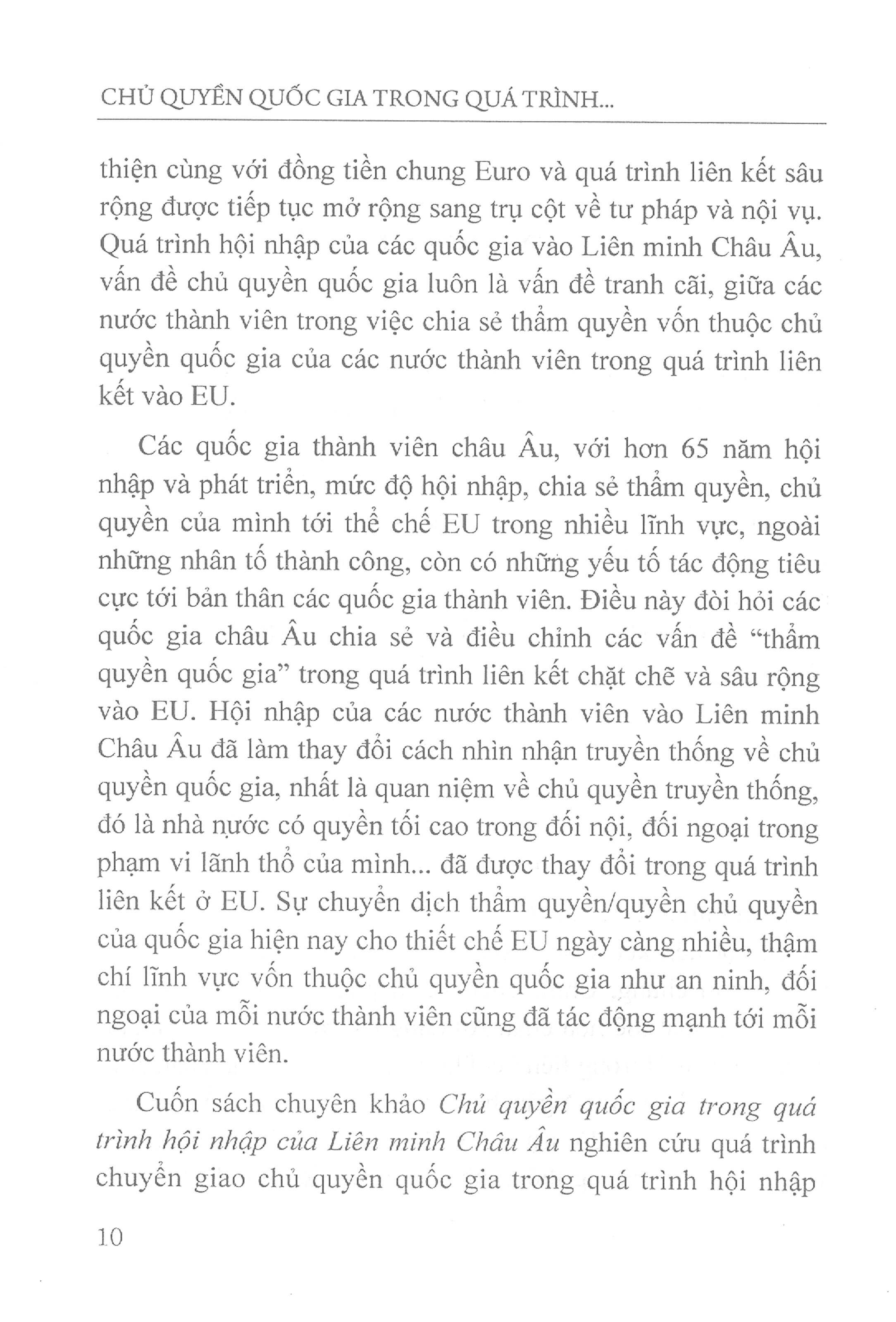 Chương 1: Một số vấn đề chung về chủ quyền quốc gia. Chương này tập trung phân tích quan niệm, nhận thức về chủ quyền quốc gia; nhận thức mới về chủ quyền quốc gia; một số lý thuyết về chia sẻ chủ quyền giải thích quá trình hội nhập khu vực; hội nhập khu vực và chủ quyền quốc gia và cơ sở pháp lý chia sẻ chủ quyền quốc gia trong quá trình liên kết ở Liên minh Châu Âu.