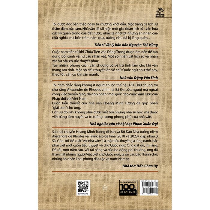 Chữ Và Người 400 Năm Cuốn sách "Chữ và người, 400 năm..." của nhà văn Hoàng Minh Tường không chỉ là một cuốn tiểu thuyết lịch sử, mà còn là một bản anh hùng ca thiêng liêng về tiếng Việt, ngôn ngữ đã làm say đắm biết bao thế hệ. Tác phẩm đưa chúng ta ngược dòng thời gian về Đàng Trong thế kỷ 17, nơi một thứ chữ viết kỳ diệu được khai sinh từ lòng trân trọng vô bờ dành cho tiếng nói dân tộc. Hành trình kỳ diệu của chữ và người Cuốn sách kể lại cuộc gặp gỡ định mệnh giữa ngôn ngữ Việt phong phú, giàu âm sắc và hệ thống chữ Latinh đơn giản. Nhân vật chính, giáo sĩ người Bồ Đào Nha Francisco de Pina, đã bị mê hoặc bởi vẻ đẹp của tiếng Việt ngay khi đặt chân đến Đại Chiêm (Hội An). Ông đã nhận ra vẻ đẹp trong sáng và sức biểu cảm của nó và bắt đầu công cuộc phiên âm tiếng Việt bằng các ký tự Latinh. Hành trình này không chỉ là một công việc học thuật đơn thuần mà còn là sự kết nối đầy cảm xúc giữa những con người ở hai nền văn hóa khác nhau. Đó là mối quan hệ giữa Pina và người học trò thông minh Bento Thiện, người thầy về ngôn ngữ Việt của ông; là sự hỗ trợ của nhà thông thái Đào Duy Từ và lòng tin của Vương Thái phi Minh Đức cùng Công nữ Ngọc Vạn. Họ đã cùng nhau thắp lên ngọn lửa của chữ viết, một di sản văn hóa vô giá của dân tộc Việt. Tác phẩm không chỉ tập trung vào công việc của các giáo sĩ mà còn đan xen những sự kiện và số phận của nhiều nhân vật lịch sử khác nhau, từ đó phác họa một bức tranh toàn cảnh về xã hội Đại Việt lúc bấy giờ. Đó là câu chuyện tình yêu đầy trắc trở giữa Nguyễn Phúc Kỳ và tiểu thư Tống Thị Toại, hay cuộc hôn nhân chính trị đầy hi sinh của công nữ Ngọc Vạn với vua Chân Lạp. Những tuyến nhân vật này không chỉ làm phong phú thêm nội dung mà còn làm nổi bật những biến động lịch sử, những âm mưu tranh quyền đoạt vị và sự giao thoa văn hóa mạnh mẽ giữa Đông và Tây. Tôn vinh tiếng Việt: Từ vẻ đẹp âm thanh đến di sản văn hóa Trong tác phẩm, tiếng Việt hiện lên như một nhân vật chính đầy sức sống. Nhà văn Hoàng Minh Tường đã cho thấy, tiếng Việt không chỉ là một công cụ để giao tiếp mà còn là một kho báu văn hóa, một dòng chảy của lịch sử và tinh thần dân tộc. "Chữ và người, 400 năm..." là một lời nhắc nhở rằng, chữ Quốc ngữ không chỉ là kết quả của một công trình nghiên cứu, mà là kết tinh của lòng trân trọng và tình yêu mãnh liệt dành cho tiếng nói cha ông. Cuốn sách giúp chúng ta nhận ra rằng mỗi nét chữ, mỗi dấu câu đều mang trong mình hơi thở của lịch sử, của sự hy sinh và tận tâm. Đây là một tác phẩm dành cho những ai muốn khám phá nguồn gốc thiêng liêng của chữ viết dân tộc và cảm nhận sâu sắc hơn vẻ đẹp của tiếng Việt, để mỗi lần đọc, ta lại thêm yêu và tự hào về ngôn ngữ của mình. Trích dẫn sách “Hai thầy Paulus Saito và Joseph xuống trước tìm người ra đón. Ấy là ngài Araki Sotaro, thương gia Nhật Bản, có đại lý lớn nhất Hải Phố, là đầu mối bán buôn, bán lẻ nhiều loại hàng hóa của người Nhật, người Hoa, người Java, Bồ Đào Nha, Hà Lan. Trong giới buôn bán hương liệu, người ta gọi ông là Nhật Kỳ Trầm. Kho trầm của ông có những khối kỳ nam giá bằng viên ngọc phỉ thúy. Hơn cả một thương gia có thế lực, Araki Sotaro còn là đại sứ ngoại giao của Nhật Hoàng và là bạn của Thụy Quận công Nguyễn Phúc Nguyên. Francisco de Pina và linh mục Pedro Marques là hai người khách cuối cùng rời khoang tàu. Họ như muốn nán lại, phóng tầm mắt để ghi lại toàn cảnh cửa biển Đại Chiêm, vùng non nước mà họ sẽ bắt đầu một chặng đời, một cuộc hành trình mà Đức Chúa Kito đã giao cho họ thiên chức đi gieo đức tin cho những con chiên chưa thuộc về Chúa Trời.” “Nàng Ngọc Vạn ở tuổi mười sáu, tuy kém phần sắc nước hương trời như bà, như mẹ và chị dâu, nhưng nàng lại có một vẻ quyến rũ thầm mà càng ngắm lâu, càng tiếp xúc thì càng mê mẩn. Ấy là vẻ nữ tính đến say nhìn, với dáng người tựa hồ như tái hiện vẻ đẹp cuốn hút của các tượng vũ nữ Chămpa trên các tòa tháp cổ, là vẻ huyền ẩn, sự ngây thơ trong sáng đến thánh thiện và lẩn sâu trong đôi mắt trong veo, trên vầng trán thanh cao là sự cương nghị quyết đoán, một thế giới nội tâm giàu có”