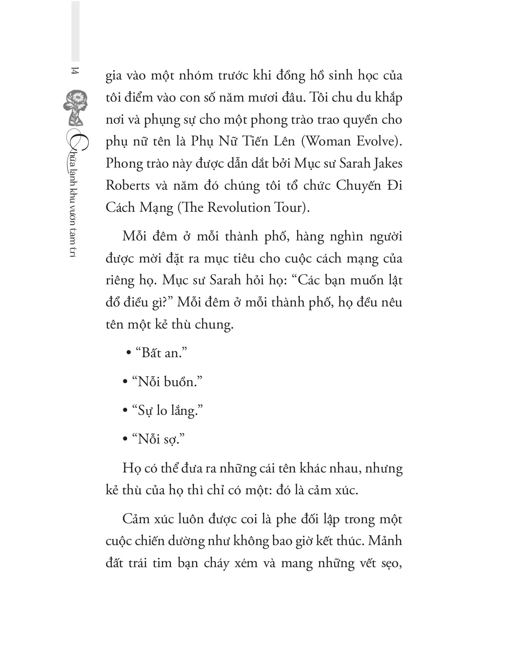 Trong cuốn sách này, nhà trị liệu chấn thương và chuyên gia sức khỏe, Tiến sĩ Anita Phillips, sẽ chỉ ra cho chúng ta thấy rằng việc đón nhận cảm xúc là chìa khóa để sống cuộc sống của bạn mạnh mẽ nhất. Giống như những khu vườn phát triển trên nền đất tốt, cuộc sống dồi dào mà bạn hằng tìm kiếm chỉ có thể nảy nở trên mảnh đất trái tim bạn.