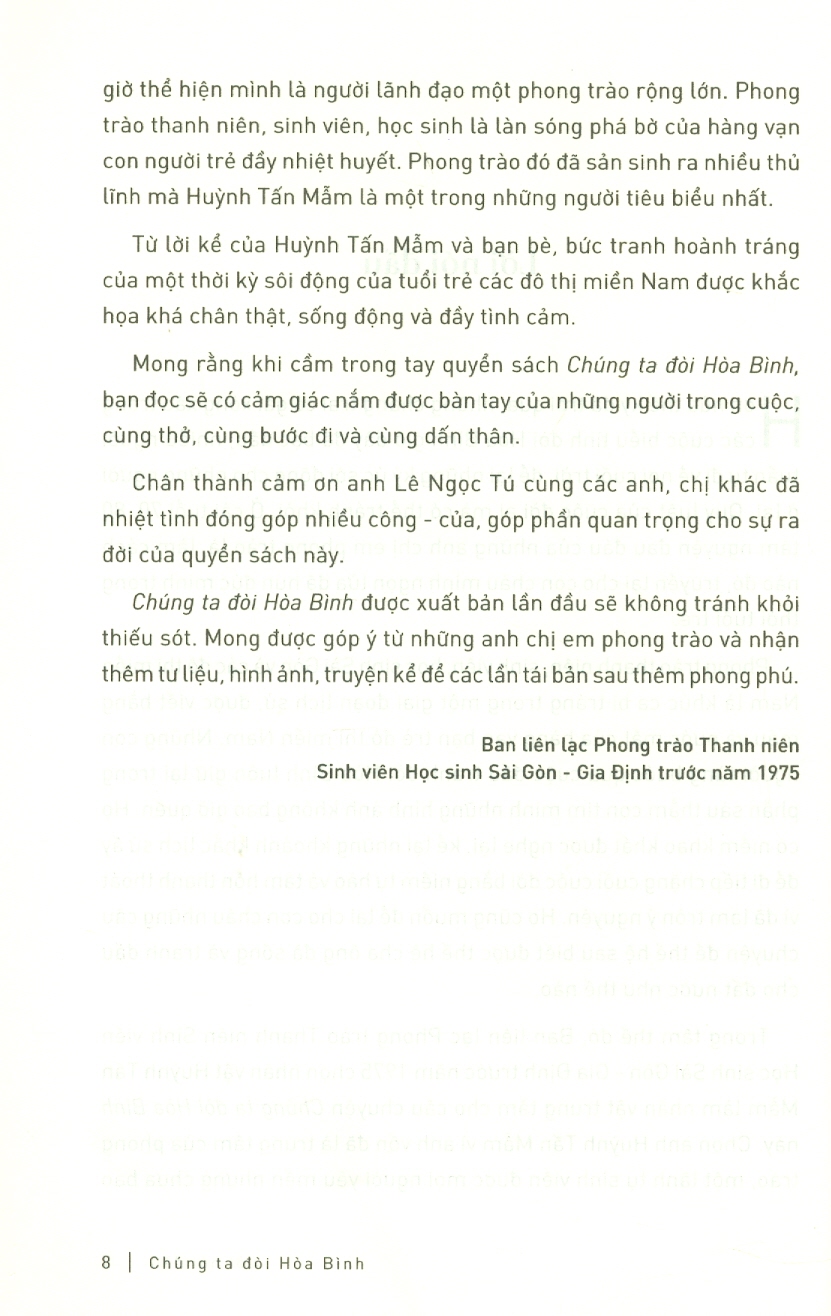 Sách ghi lại hồi ức của ông Huỳnh Tấn Mẫm, và các thành viên của Tổng hội Sinh viên Sài Gòn về phong trào đấu tranh đòi hòa bình của thanh niên, sinh viên, học sinh Sài Gòn trong giai đoạn 1969 - 1975.
