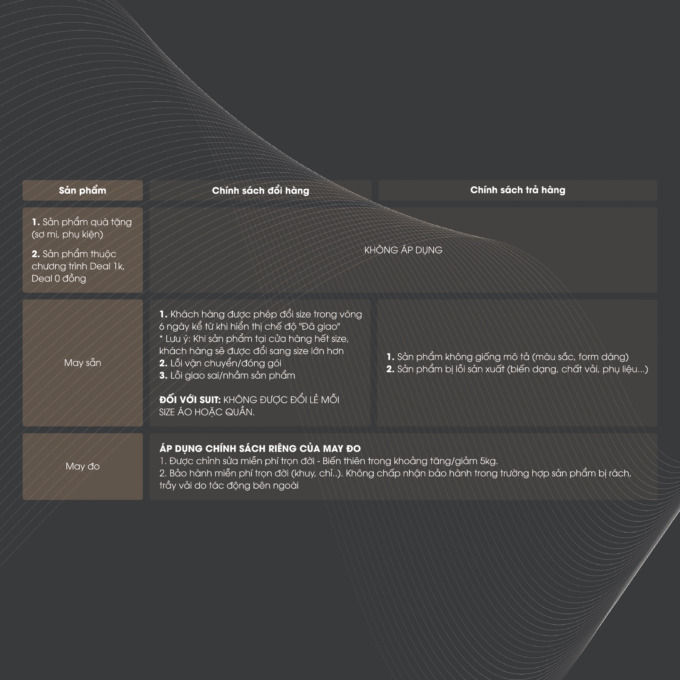 - 01 quần tây side tab (new version) MÔ TẢ SẢN PHẨM: Những bộ suit với tông xanh navy luôn được đánh giá cao bởi sự thanh lịch, tinh tế nhưng cũng toát lên vẻ mạnh mẽ, đầy bản lĩnh. Thiết kế suit xanh navy với 2 khuy cổ điển, kết hợp cùng chi tiết túi nắp và form dáng slim-fit, mang lại sự thoải mái nhưng vẫn tôn lên vóc dáng của quý ông. Đây là lựa chọn lý tưởng cho các buổi gặp gỡ đối tác, những cuộc họp quan trọng hoặc các sự kiện cần sự chuyên nghiệp và đẳng cấp. Navy không chỉ đơn thuần là màu sắc, mà còn là biểu tượng của sự tự tin và quyền lực. ĐẶC ĐIỂM SẢN PHẨM: