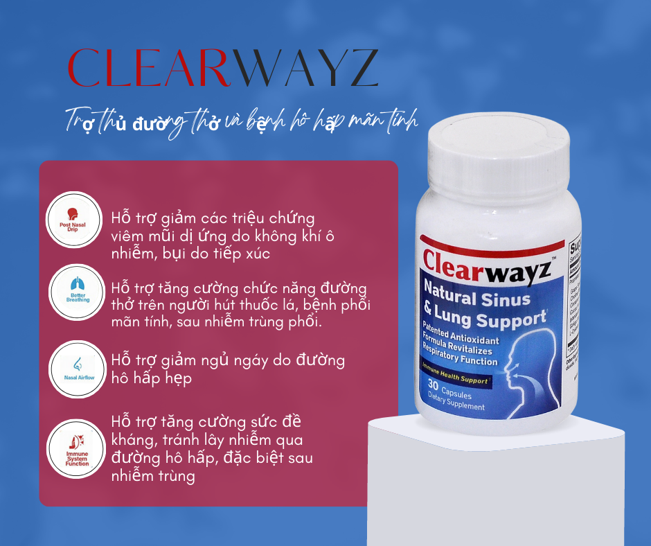 Mua tại TiktokMỤC ĐÍCH SỬ DỤNG: Dị ứng thời tiết, phấn hoa… thường dẫn đến hắt hơi, khó thở. Các bệnh mãn tính như COPD, hen suyễn, tim mạch… thường gây khó thở, nhất là vào ban đêm. Người bị béo phì, đường thở hẹp... dẫn đến ngáy rất to khi ngủ, gây khó chịu cho người ngủ cùng, về lâu dài gây thiếu oxy máu dẫn đến nhiều bệnh lý mãn tính như bệnh tim mạch, giảm trí nhớ… Clearwayz giữ đường thở luôn thông thoáng, tăng miễn dịch hô hấp cho những đối tượng trên. Clearwayz giúp: