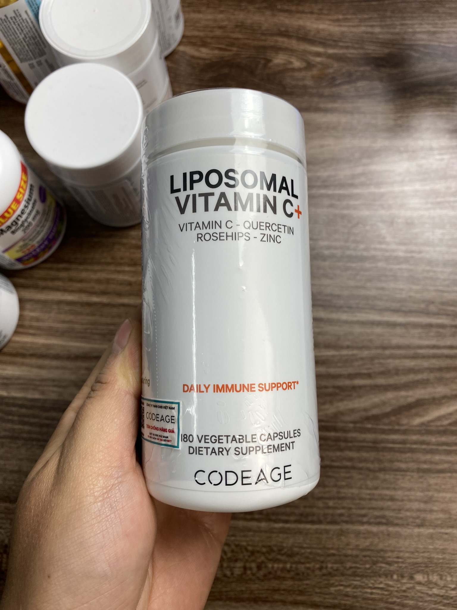 - Số xác nhận nội dung quảng cáo 1234/2023/XNQC-ATTP Mô tả sản phẩm Codeage Liposomal Vitamin C - Sản phẩm hỗ trợ bổ sung Vitamin C thế hệ mới Codeage Liposomal Vitamin C là một dòng sản phẩm độc đáo, đặc biệt thiết kế để hỗ trợ cung cấp Vitamin C thông qua phương thức uống. Xuất xứ chính hãng từ Mỹ và quá trình sản xuất tại nhà máy tuân thủ tiêu chuẩn cGMP, sản phẩm này đảm bảo nguồn gốc xuất xứ và chất lượng cao được chứng nhận bởi FDA Hoa Kỳ. Với mỗi liều lượng 500mg Vitamin C, Codeage Liposomal Vitamin C là lựa chọn lý tưởng để bổ sung hàng ngày mà không gây thừa Vitamin C, hỗ trợ duy trì sự cân bằng dưỡng chất trong cơ thể. Công thức độc đáo của sản phẩm tích hợp Vitamin C tự nhiên từ trái cây. Điểm nổi bật của sản phẩm Công nghệ Liposome là một đặc điểm nổi bật của Codeage Liposomal Vitamin C, giúp hỗ trợ tăng cường sự hấp thụ của Vitamin C, đồng thời bảo vệ chất này khỏi sự thoái hóa trong quá trình hấp thụ. Lớp phospholipid của Liposome không chỉ giúp vượt qua rào cản ruột mà còn hỗ trợ bảo vệ Vitamin C khi di chuyển từ ruột vào máu. Giới thiệu về thương hiệu Codeage Codeage là thương hiệu nổi tiếng đến từ Mỹ, chuyên cung cấp các sản phẩm chăm sóc sức khỏe và bổ sung dinh dưỡng chất lượng cao. Thương hiệu luôn chú trọng đến việc nghiên cứu và phát triển các sản phẩm dinh dưỡng dựa trên khoa học, kết hợp với nguyên liệu tự nhiên. Các sản phẩm của Codeage được sản xuất tại các cơ sở đạt chuẩn cGMP, đảm bảo chất lượng và sự an tâm cho người tiêu dùng. Thành phần Codeage Liposomal Vitamin C không chỉ là một nguồn cung cấp Vitamin C mạnh mẽ mà còn chứa một hỗn hợp độc đáo của các thành phần khác nhau để tối ưu hóa lợi ích cho sức khỏe. Dưới đây là thành phần chi tiết: