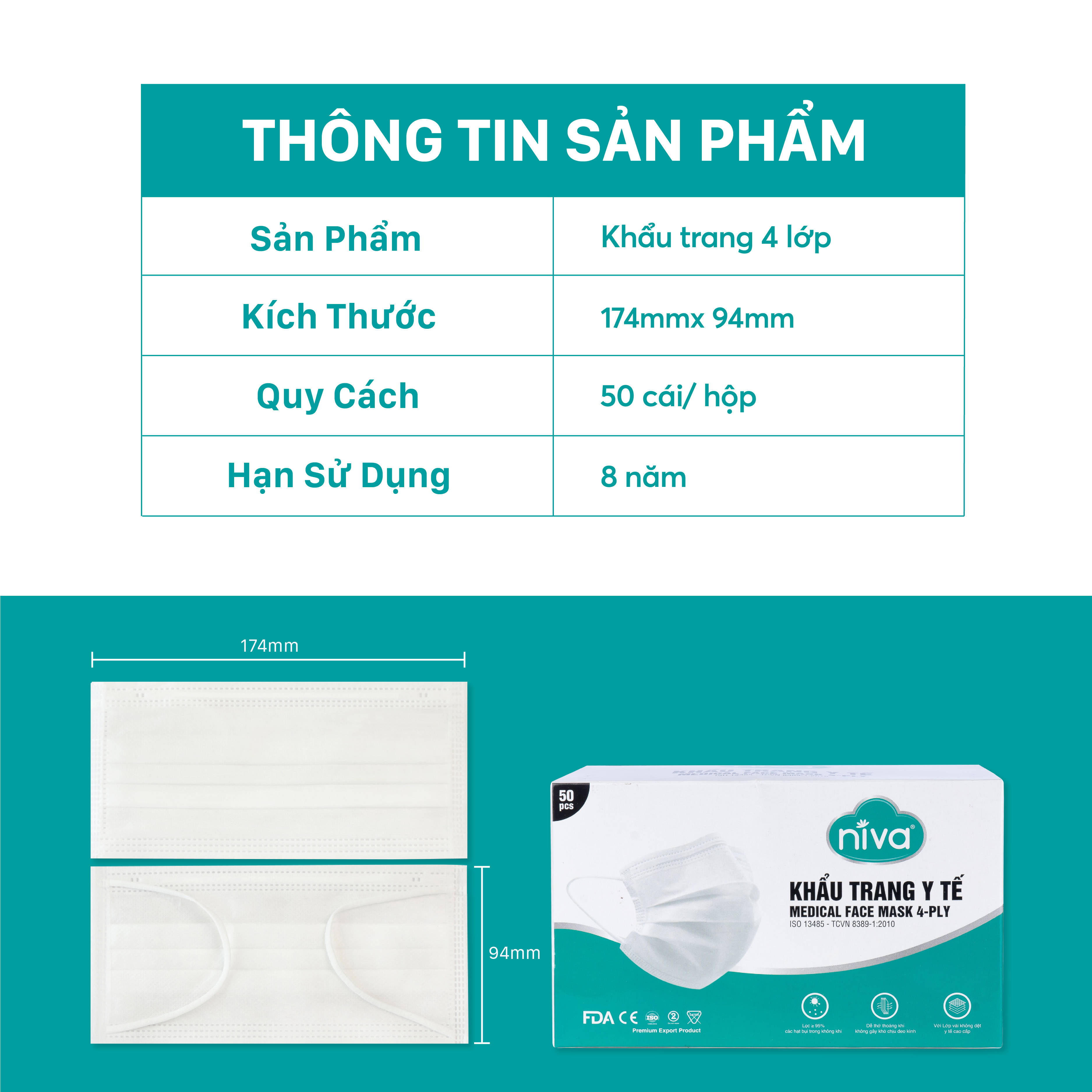 Mua tại TiktokCOMBO 05 HỘP KHẨU TRANG Y TẾ 4 LỚP NIVA (HỘP 50 CÁI) Khẩu trang y tế 4 lớp người lớn Niva ứng dụng công nghệ Meltblown với khả năng kháng khuẩn và lọc khói bụi hiệu quả. Thiết kế linh hoạt, mang lại sự thoải mái tối đa khi sử dụng. THÔNG TIN SẢN PHẨM: