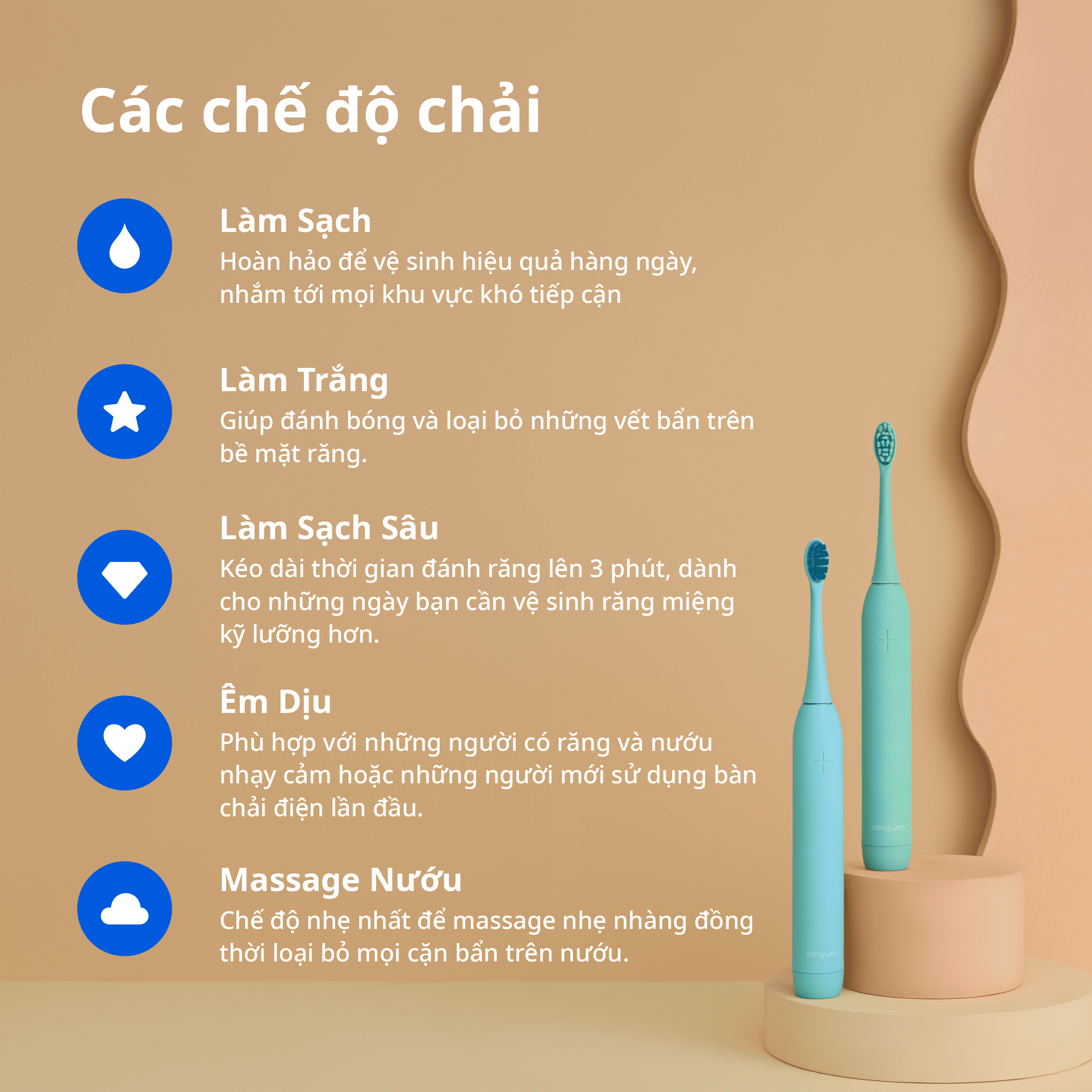 > Công nghệ xung động nước tần số cao (1400 - 1800 lần/phút). Giúp làm sạch hiệu quả thức ăn, mảng bám trong từng kẽ răng