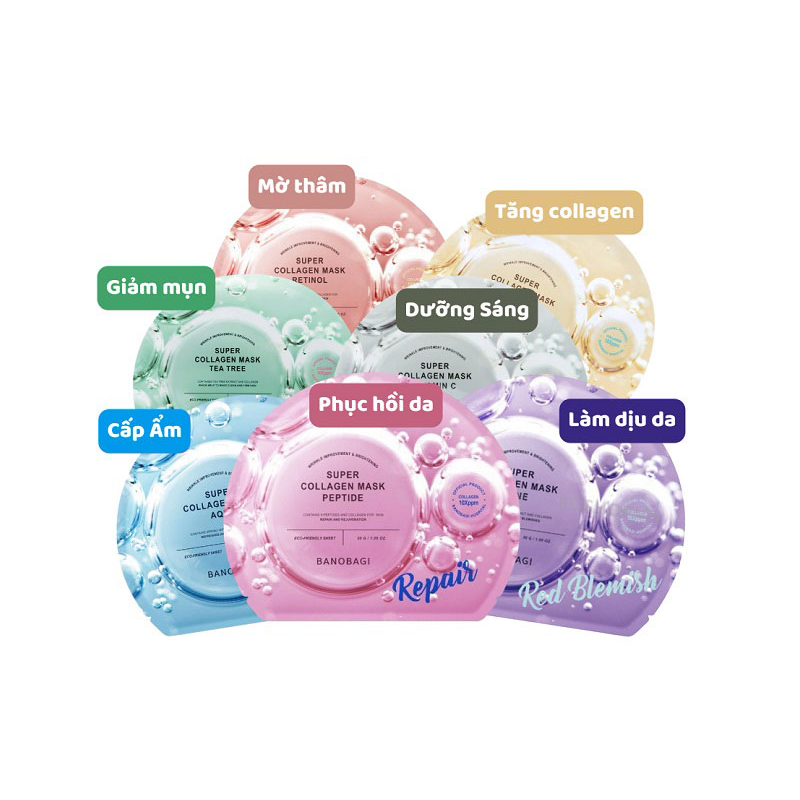 Pore Tightening: Thu nhỏ lỗ chân lông và kiểm soát bã nhờn. **Dòng 2: Mặt nạ BANOBAGI Super Collagen Mask :