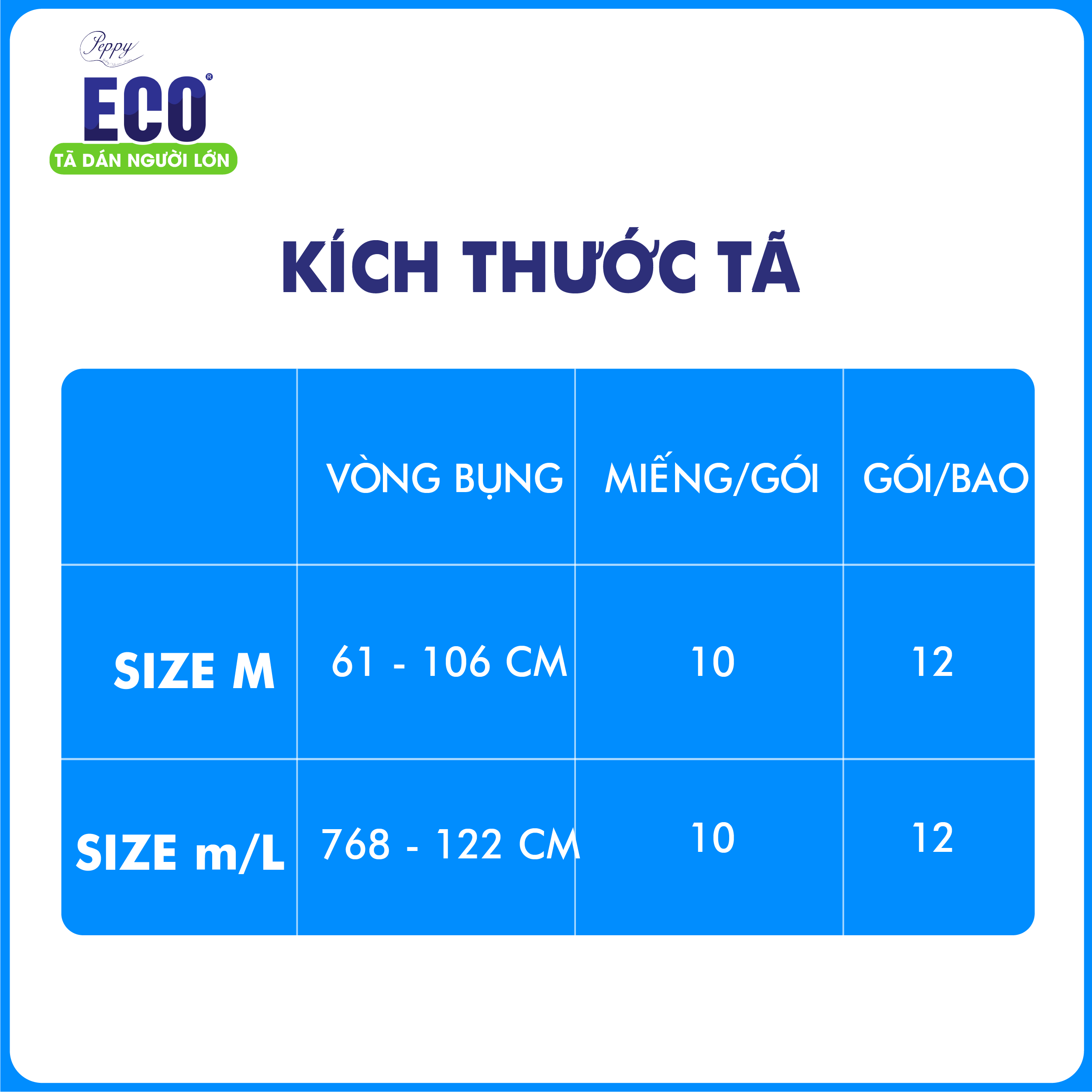 Combo 2 gói Tã Dán Người Lớn Peppy Eco Siêu Mềm Mại, Siêu Khô Thoáng, Kháng khuẩn Size M/L I. MÔ TẢ SẢN PHẨM Tã dán người lớn ECO được thiết kế dành riêng