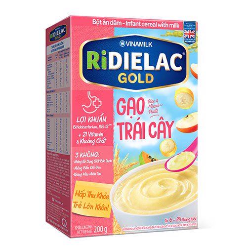 - Sản phẩm này là thức ăn bổ sung và được ăn thêm cùng với sữa mẹ dùng cho trẻ trên 06 tháng tuổi Bột ăn dặm RiDielac Gold dễ tiêu hóa được nghiên cứu bởi các chuyên gia từ Trung tâm nghiên cứu dinh dưỡng và phát triển sản phẩm VINAMILK, đáp ứng nhu cầu dinh dưỡng cho trẻ từ 6 đến 24 tháng tuổi, giúp bổ sung các dưỡng chất, hỗ trợ bé phát triển thể chất trong thời gian ăn dặm. HỖ TRỢ SỨC KHỎE HỆ TIÊU HÓA Bổ sung lợi khuẩn Bifidobacterium, BB-12TM cùng chất xơ hòa tan inulin giúp tăng vi khuẩn có lợi, ức chế vi khuẩn có hại, hỗ trợ tốt sức khỏe hệ tiêu hóa, giúp bé hấp thu nguồn dưỡng chất dồi dào, cho bé phát triển thể chất khỏe mạnh. BB-12 là thương hiệu của Chr. Hansen A/S. HỖ TRỢ DƯỠNG CHẤT CHO BÉ ĂN NGON VÀ KHỎE MẠNH Lysin, vitamin nhóm B và Kẽm giúp bé ăn ngon miệng. Ngoài ra, sản phẩm có chứa 21 vitamin và khoáng chất bao gồm Sắt, Canxi, vitamin D3, C, A, E, giúp bé phát triển cứng cáp hơn. HỖ TRỢ PHÁT TRIỂN NÃO BỘ Axít folic, I ốt, Sắt, Taurin, Axít linoleic, đặc biệt DHA kết hợp với Lutein tạo thành hệ dưỡng chất thiết yếu cho sự phát triển của não bộ, võng mạc mắt, tăng khả năng nhận thức, ghi nhớ và học hỏi của bé. Đối tượng sử dụng: Bé từ 6-24 tháng tuổi. 5 DẤU HIỆU BÉ YÊU SẴN SÀNG ĂN DẶM THÔNG SỐ SẢN PHẨM Thành phần trung bình (100g bột) Đơn vị 100g Bột Năng lượng/ Energy Kcal 418.0 Chất đạm/ Protein g 15.0 Chất béo/ Fat g 9.0 Acid linoleic mg 4,400.0 DHA (Docosahexaenoic acid) mg 20.0 Hydrat Cacbon/ Carbohydrate g 68.5 Chất xơ hòa tan/ Soluble fiber g 2.0 Lysin/ Lysine mg 1,000.0 Taurin/ Taurine mg 40.0 Lutein mcg 35.0 Độ ẩm/ Moisture g 2.5 Khoáng chất/ Minerals Natri/ Sodium mg 150.0 Kali/ Potassium mg 550.0 Calci/ Calcium mg 470.0 Phospho/ Phosphorus mg 350.0 Magnesi/ Magnesium mg 35.0 Sắt/ Iron mg 7.7 Iod/ Iodine mcg 80.0 Kẽm/ Zinc mg 3.2 Vitamin/ Vitamins Vitamin A IU 1,600.0 Vitamin D3 IU 260.0 Vitamin E mg 4.2 Vitamin K1 mcg 20.0 Vitamin C mg 52.0 Vitamin B1 mcg 820.0 Vitamin B2 mcg 700.0 Vitamin PP mg 6.7 Vitamin B6 mcg 810.0 Acid folic mcg 82.0 Acid Pantothenic mg 2.5 Vitamin B12 mcg 1.2 Biotin mcg 21.0 MẪU BAO BÌ THAY ĐỔI THEO TỪNG ĐỢT NHẬP HÀNG.
