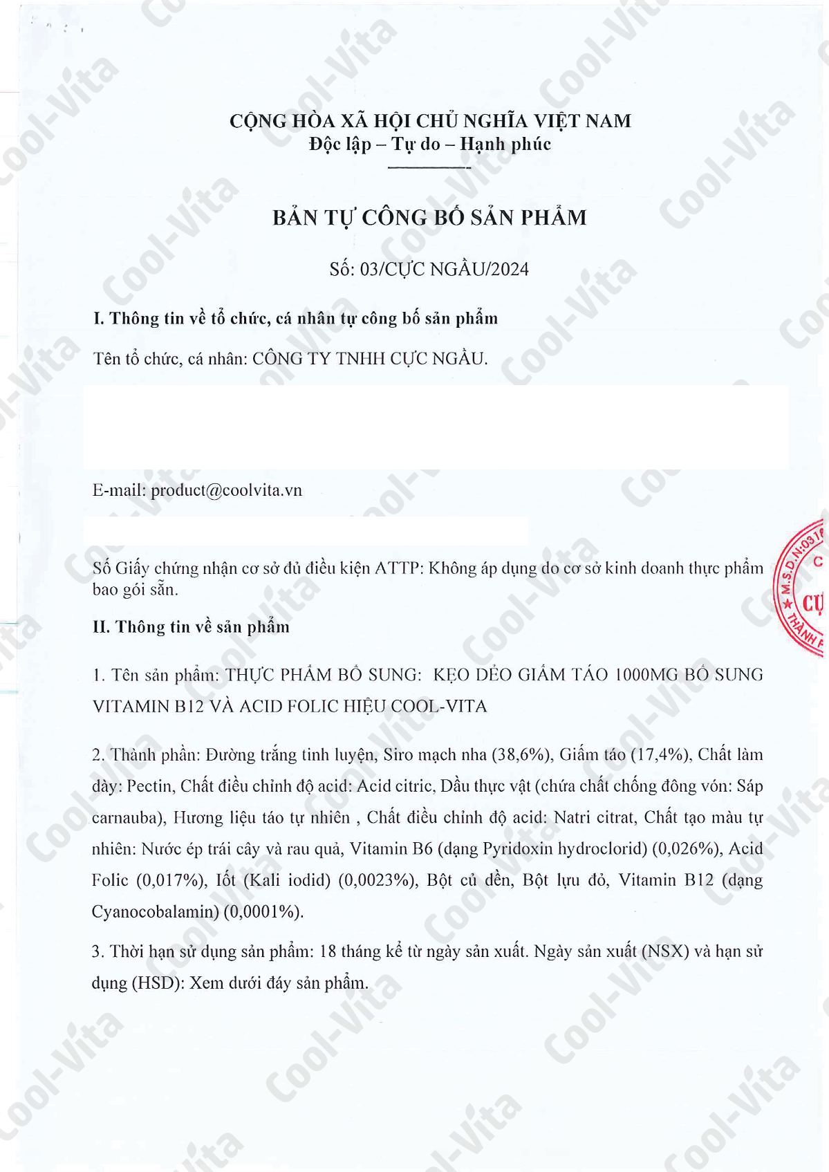 Đường trắng tinh luyện, Siro mạch nha (38,6%), Giấm táo (17,4%), Chất làm dày: Pectin, Chất điều chỉnh độ acid: Acid citric, Dầu thực vật (chứa chất chống đông vón: Sáp carnauba), Hương liệu táo tự nhiên, Chất điều chỉnh độ acid: Natri citrat, Chất tạo màu tự nhiên: Nước ép trái cây và rau quả, Vitamin B6 (dạng Pyridoxin hydrochlorid) (0,026%), Acid Folic (0,017%), Iốt (Kali iodid) (0,0023%), Bột củ dền, Bột lựu đỏ, Vitamin B12 (dạng Cyanocobalamin) (0,0001%).