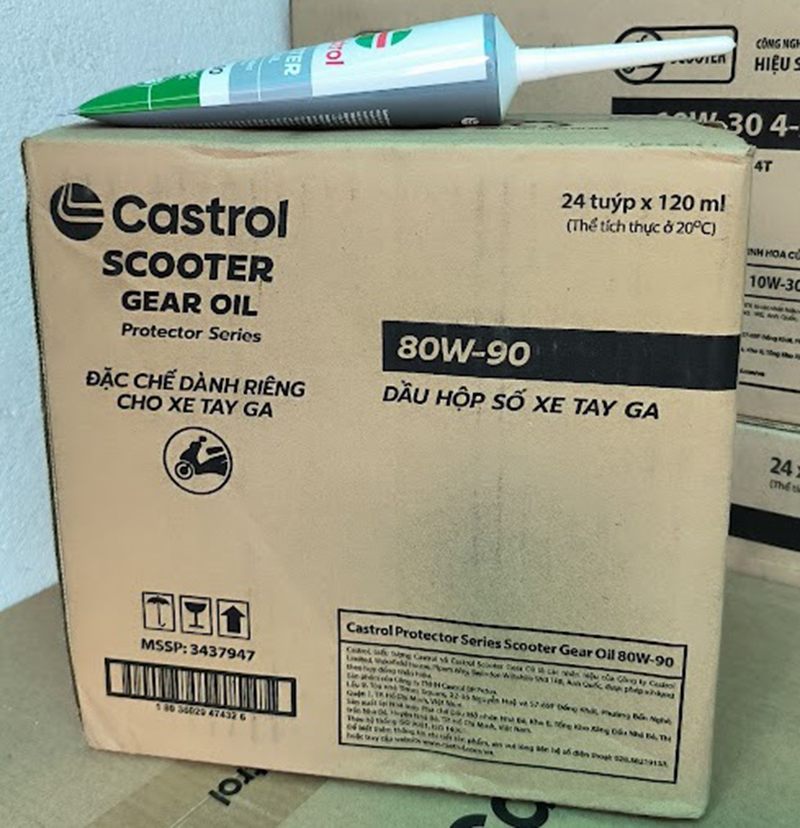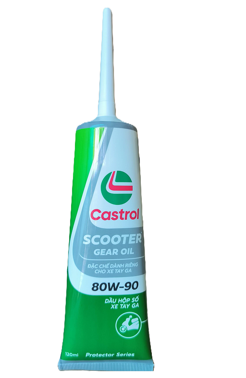 - Công suất tối đa phù hợp với các động cơ có trang bị bộ xúc tác khí thải. Khả năng tăng tốc phụ thuộc vào cách lái xe và độ nhớt của sản phẩm. Quy cách đóng chai: Chai 800ML (0,8 lít). Castrol Scooter Gear oil là dầu hộp số cho xe tay ga (hay còn gọi là dầu Láp) Tiêu chuẩn kỹ thuật: SAE 80W-90, API GL-5 Thể tích thực: 120ml (0,12 lít). Nhiều người sử dụng xe ga thường chỉ nhớ thay dầu động cơ mà quên thay dầu hộp số định kỳ, nếu tình trạng này kéo dài sẽ dẫn đến dầu hộp số cũ trong xe bị hỏng và mất khả năng bôi trơn dẫn đến hỏng bộ bánh răng hộp số, do vậy chúng ta cũng cần phải thay định kỳ dầu hộp số cho xe tay ga, thông thường thì 2 lần thay dầu động cơ thì nên thay dầu hộp số 1 lần.