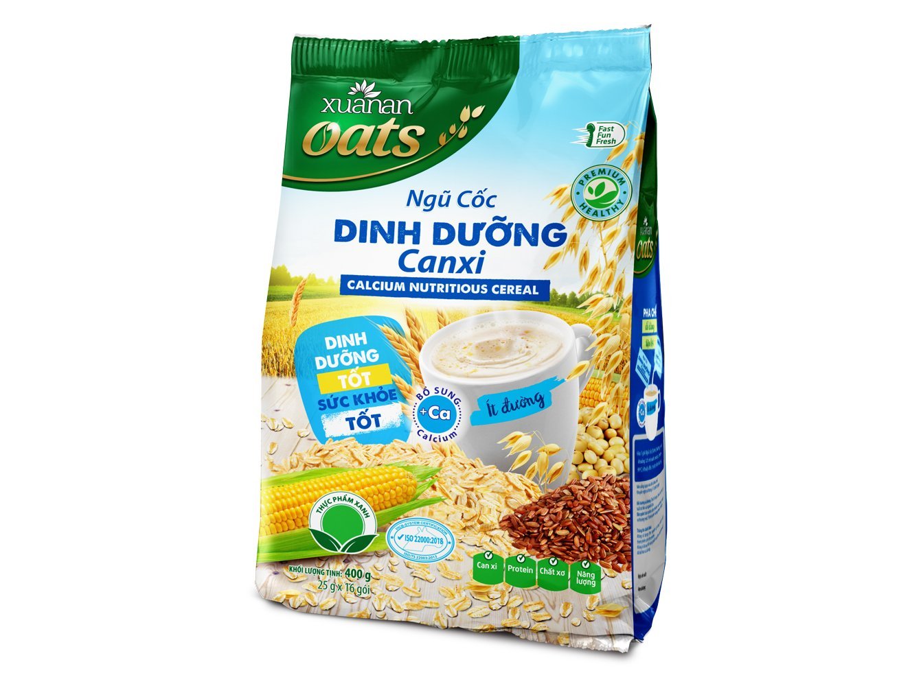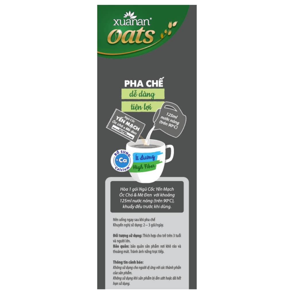 Combo Ngũ Cốc Yến Mạch Óc Chó Và Mè Đen 400G (25G16 GÓI) + Ngũ Cốc Dinh Dưỡng Canxi 400G (25G16 GÓI) [ít đường]  Yến Mạch, Óc chó và Mè đen là ba loại hạt được dùng khá phổ biến đối với mỗi gia đình vì chúng có tác dụng rất tốt cho sức khỏe. Đặc biệt, chúng phù hợp sử dụng với nhiều lứa tuổi, ngay cả trẻ nhỏ. Khi kết hợp 3 nguyên liệu này trong chế biến ngũ cốc thì chúng là loại ngũ cốc “Ngũ cốc Yến mạch, Óc chó và Mè đen” siêu hương vị thơm ngon, dinh dưỡng, ngậy béo nhưng không ngấy. Ngũ cốc DINH DƯỠNG can xi được làm từ rất nhiều loại ngũ cốc bằng công thứ đặc biệt. Sản phẩm được bổ sung Can xi giúp ngăn ngừa loãng xương và sử dụng ít đường. Vitamin, chất xơ và đạm tự nhiên là nguồn dinh dưỡng tốt cho sức khỏe. Thành phần: Ngũ cốc 32% (Yến mạch 10%, bột gạo lứt 5%, bột gạo, bột bắp, bột đậu nành, bột lúa mì, lúa mạch), sữa bột nguyên kem, bột dừa, bột kem thực vật, đường, muối i-ốt, Canxi 0.7%, maltodextrin, chất là dày xanhthan gum (E415), chất chống đông vón (E551), hương liệu tổng hợp dùng cho thực phẩm. 6.75 g đường trong 1 khẩu phần 25g. Đối tượng sử dụng: Trẻ từ 3 tuổi trở lên và người lớn, người ăn theo chế độ giảm đường. Hướng dẫn sử dụng: Hòa 1 gói Ngũ cốc với khoảng 125ml nước sôi, khuấy đều trước khi dùng. Dùng 2-3 gói mỗi ngày Bảo quản: Bảo quản nơi khô ráo, thoáng mát; tránh tiếp xúc trực tiếp với không khí và ánh nắng mặt trời. Thông tin cảnh báo: Không dùng khi sản phẩm bị rách, mốc hoặc đã hết hạn sử dụng. Sản phẩm của: Công ty TNHH Thực Phẩm Dinh Dưỡng Xuân An