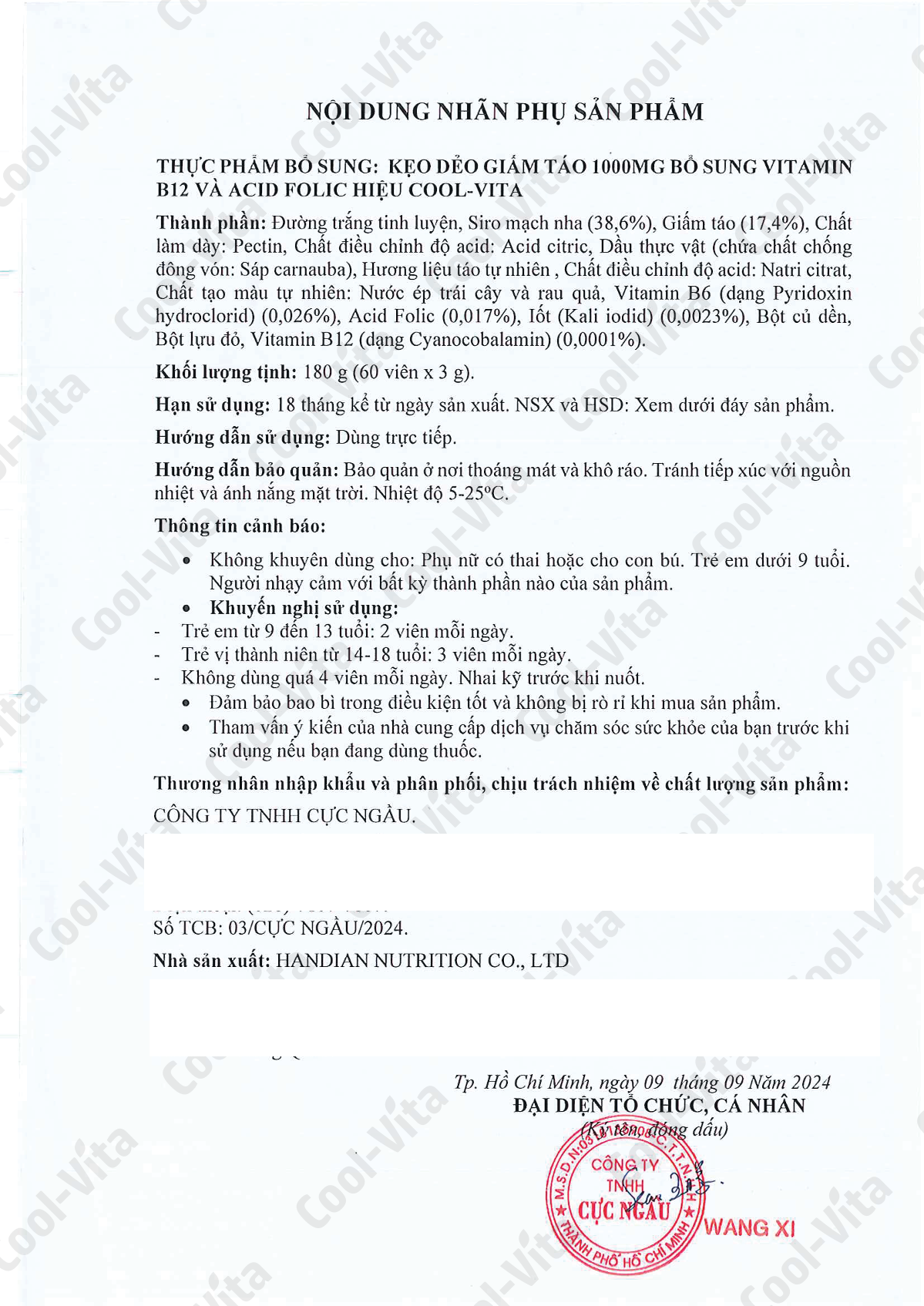 Kẹo dẻo giấm táo giúp bổ sung thêm Vitamin B12 & Axit Folic là một giải pháp bổ sung dinh dưỡng tiện lợi, hỗ trợ bạn cải thiện sức khỏe tiêu hóa, tăng cường hệ miễn dịch. Mỗi 2 viên kẹo dẻo chứa 1000mg giấm táo nguyên chất, kết hợp với các dưỡng chất quan trọng như Vitamin B12, Vitamin B6 và Axit Folic, mang lại hiệu quả tuyệt vời cho sức khỏe. Nếu bạn đang mong muốn cải thiện sức khỏe từ bên trong thì đừng nên bỏ qua sản phẩm Kẹo Dẻo Giấm Táo của CoolVita nhé!