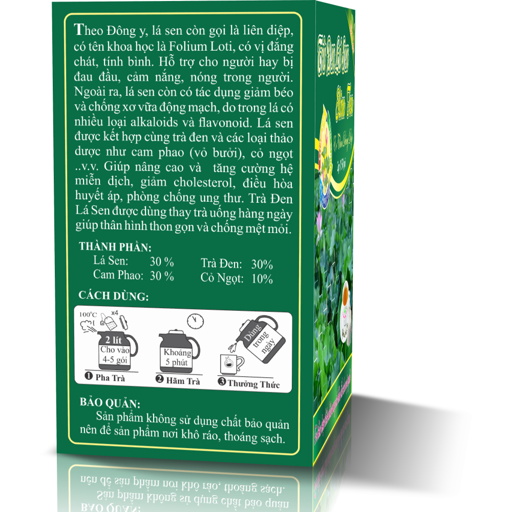 TRÀ ĐEN LÁ SEN Theo Đông y, lá sen còn gọi là liên diệp, có tên khoa học là Folium Loti, có vị đắng chát, tính bình. Dùng để trị các chứng xuất huyết, cảm nắng, say nắng, đau bụng tiêu chảy. Ngoài ra, lá sen còn có tác dụng giảm béo và chống xơ vữa động mạch, do trong lá có nhiều loại alkaloids và flavonoid. Lá sen được kết hợp cùng trà đen và các loại thảo dược như cam phao (vỏ bưởi), cỏ ngọt Giúp nâng cao và tăng cường hệ miễn dịch, giảm cholesterol, điều hòa huyết áp, phòng chống ung thư. Trà Đen Lá Sen được dùng thay trà uống hàng ngày giúp thân hình thon gọn và chống mệt mỏi.