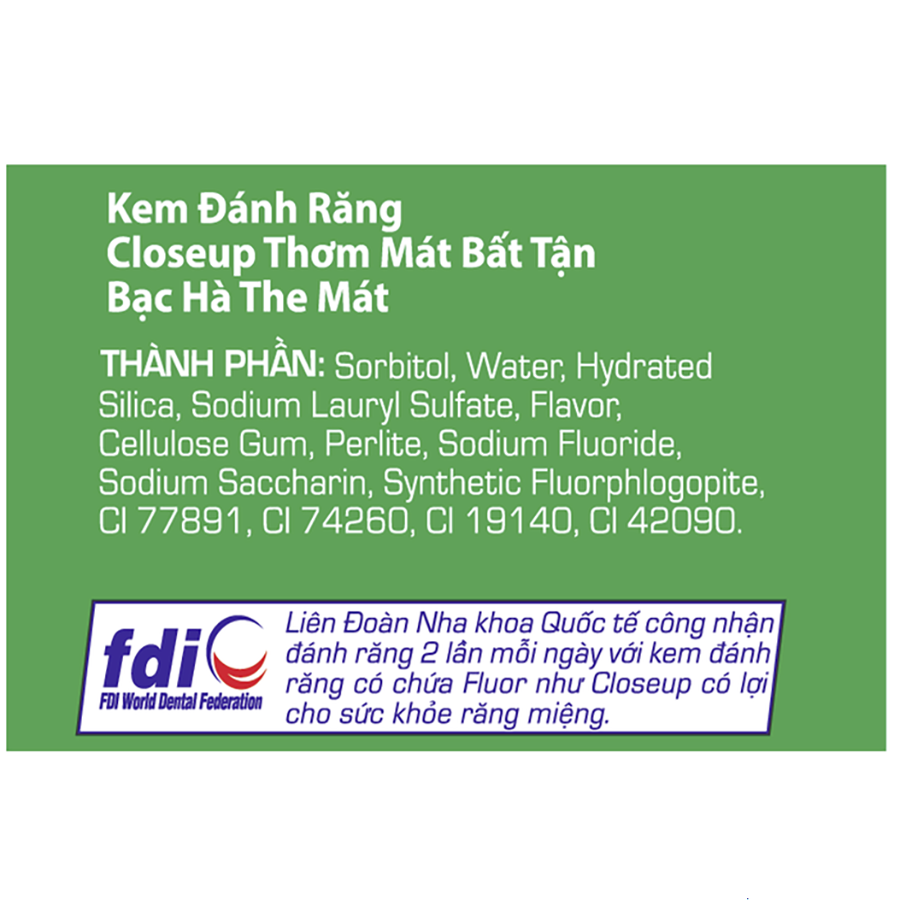 Kem Đánh Răng Closeup White Now Với Khoáng Trắng Tự Nhiên 100g Thành Phần Chính Và Công Dụng: - Sự kết hợp độc đáo của các hạt sắc tố màu xanh trong kem gel tạo