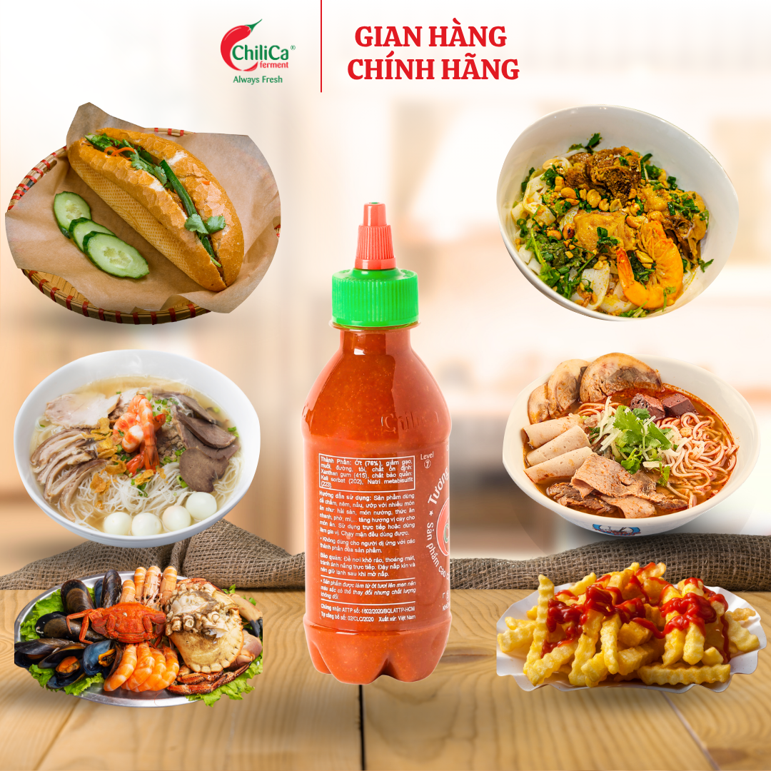 - Phù hợp với mọi món ăn, chay mặn đều dùng được. Hãy thử và cảm nhận! Tương Ớt và Ớt Bằm Chilica được làm từ 100% ớt chỉ thiên chọn lọc, trải qua quá trình lên men tự nhiên kết hợp với công nghệ sản xuất hiện đại, đáp ứng các tiêu chuẩn về vệ sinh an toàn thực phẩm, tạo ra sản phẩm có hương vị đặc biệt thơm ngon, phù hợp với mọi bữa ăn trong gia đình. Tương Ớt và Ớt Bằm Chilica không sử dụng chất tạo màu, tạo mùi, tạo cay, chất độn....Từ khâu đầu tiên đến khâu cuối cùng đều được tự động hóa, giảm thiểu tối đa sự tác động của con người. Chua cay mê ngay: Tương Ớt và Ớt Bằm Chilica là sự kết hợp hài hòa của những nguyên liệu tốt và tự nhiên nhất như: ớt chỉ thiên, giấm, đường, muối... Ớt sau khi xay được đưa vào ủ lên men tự nhiên nên có mùi thơm, vị chua cay thanh rất dễ chịu;đáp ứng mọi tiêu chuẩn khắt khe cũng như khẩu vị của người sành ăn.