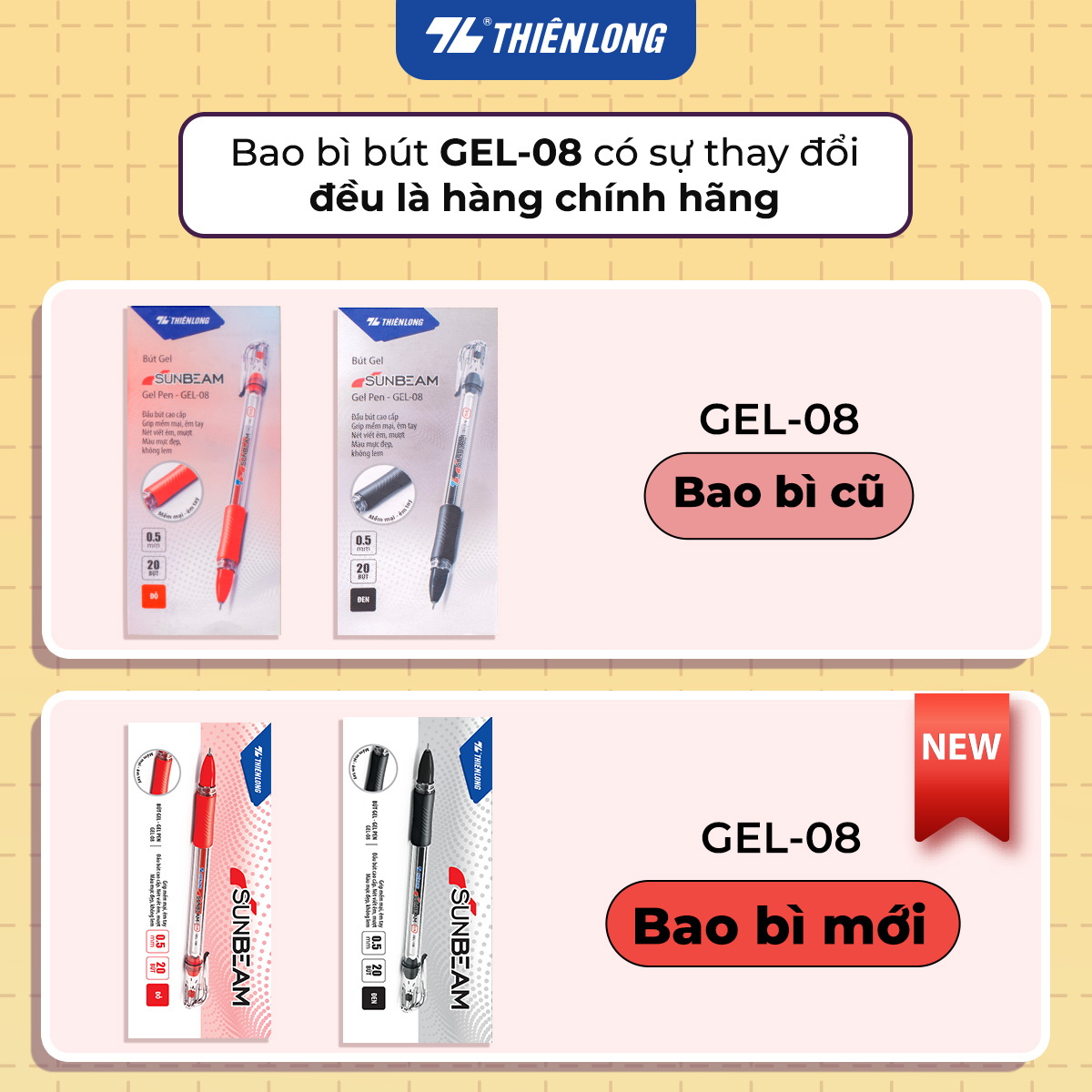 Mô tả sản phẩm Thông số kĩ thuật : Tên danh mục Bút Gel B Thương hiệu Thiên Long Đường kính viên bi 0.5mm Màu mực Xanh/đỏ/đen Đóng gói 20 cây/hộp Trọng lượng 10 gram