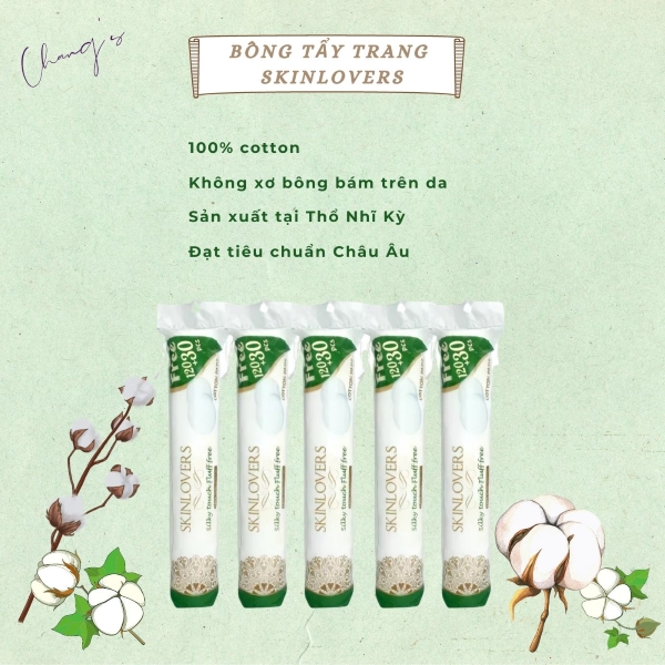 Mô tả sản phẩm: Bông tẩy trang Skinlovers là sản phẩm bông tẩy trang được sản xuất từ 100% bông tự nhiên trên dây chuyền công nghệ hiện đại, chất lượng bông đạt chuẩn EU giúp tẩy trang và làm sạch mọi bụi bẩn bám trên da. Những miếng bông Skinlovers có hình tròn, được dệt thành hai mặt và đóng gói trong túi, có dây rút rất tiện lợi và đảm bảo vệ sinh cho người sử dụng. Đặc biệt, mỗi miếng bông có độ dày vừa phải, được chấm viền mép, rất mềm mịn nhẹ nhàng chăm sóc da, không để lại xơ bông và không gây tốn dung dịch. Với thiết kế sang trọng, bông tẩy trang Skinlovers ngày càng được ưa chuộng với thành phần an toàn, không pha nilon nên an toàn cho mọi loại da, dù là làn da mụn hay da nhạy cảm.