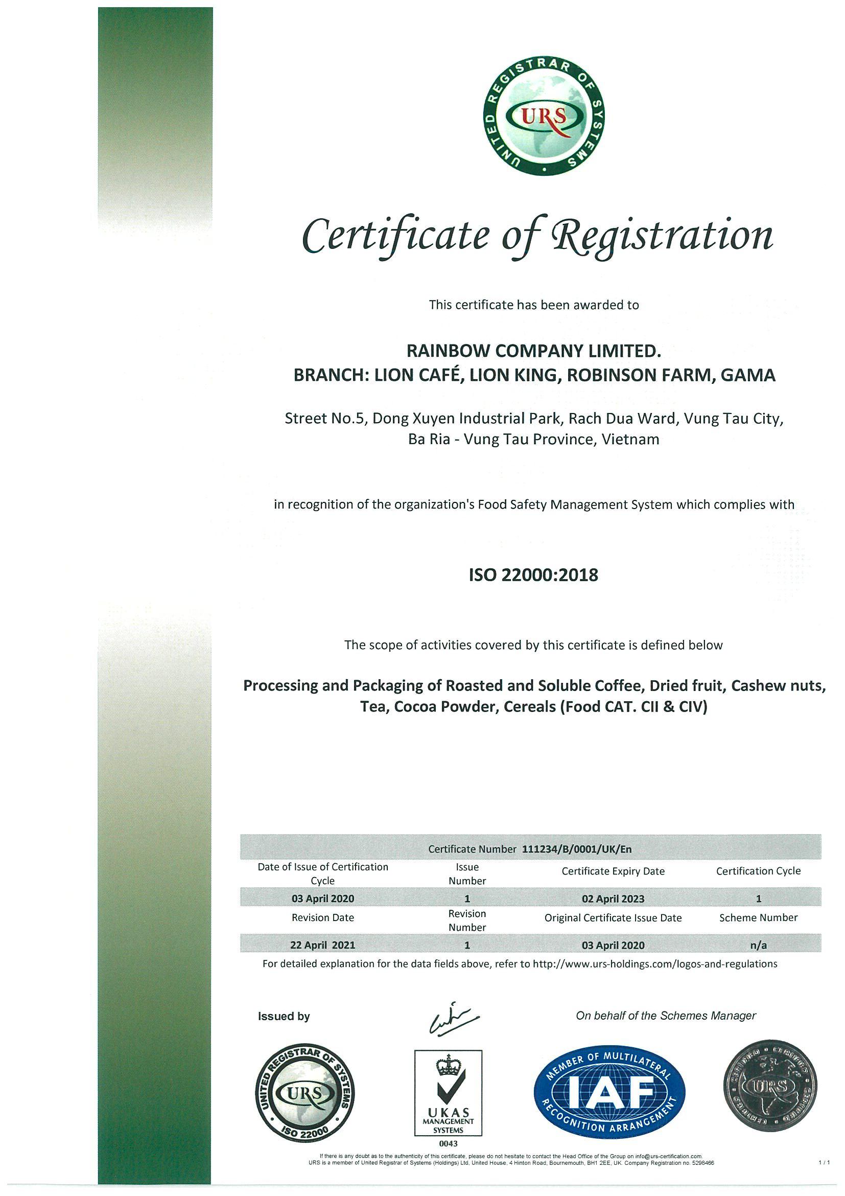 ️Đạt Chứng nhận quốc tế ISO 22000:2018 An Toàn Thực Phẩm cấp bởi Tổ Chức URS Anh Quốc.