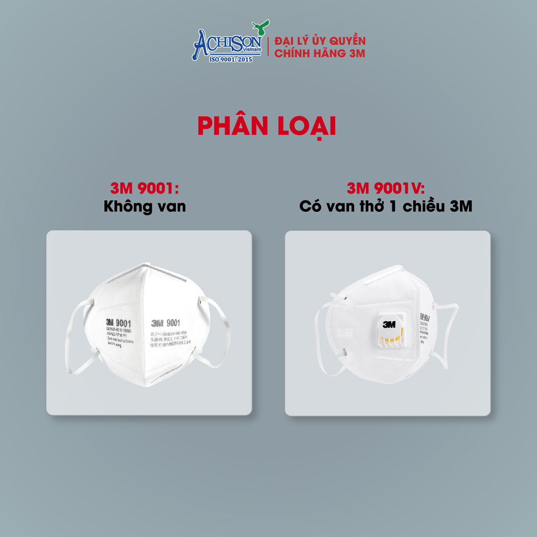 Mua tại TiktokKhẩu Trang Chống Bụi 3M 9001 (Không Van) / 9001V (Có Van) - Khẩu Trang 3M Chính Hãng, Màng Lọc Tiên Tiến Sản phẩm chính hãng 100% được phân phối bởi ACHISON Xuất xứ: Mỹ • Thương hiệu: 3M THÔNG SỐ KỸ THUẬT: • Công dụng: Lọc bụi • Chất liệu: Màng lọc tĩnh điện tiên tiến công nghệ 3M, dây thun cao su • Không gây kích ứng cho da • Sản phẩm được sản xuất từ 01/12/2020 bổ sung thêm tiêu chuẩn KN90 • Hộp khẩu trang được sản xuất từ 01/12/2020 thay đổi hình ảnh người đeo khẩu trang • Phân loại: