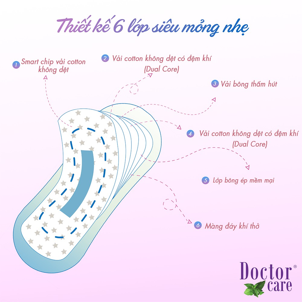 - Băng vệ sinh thảo dược Doctor Care hàng ngày có cấu trúc 3D gồm 6 lớp thấm hút và kháng khuẩn nhưng vẫn giữ được kết cấu siêu mỏng, siêu nhẹ
