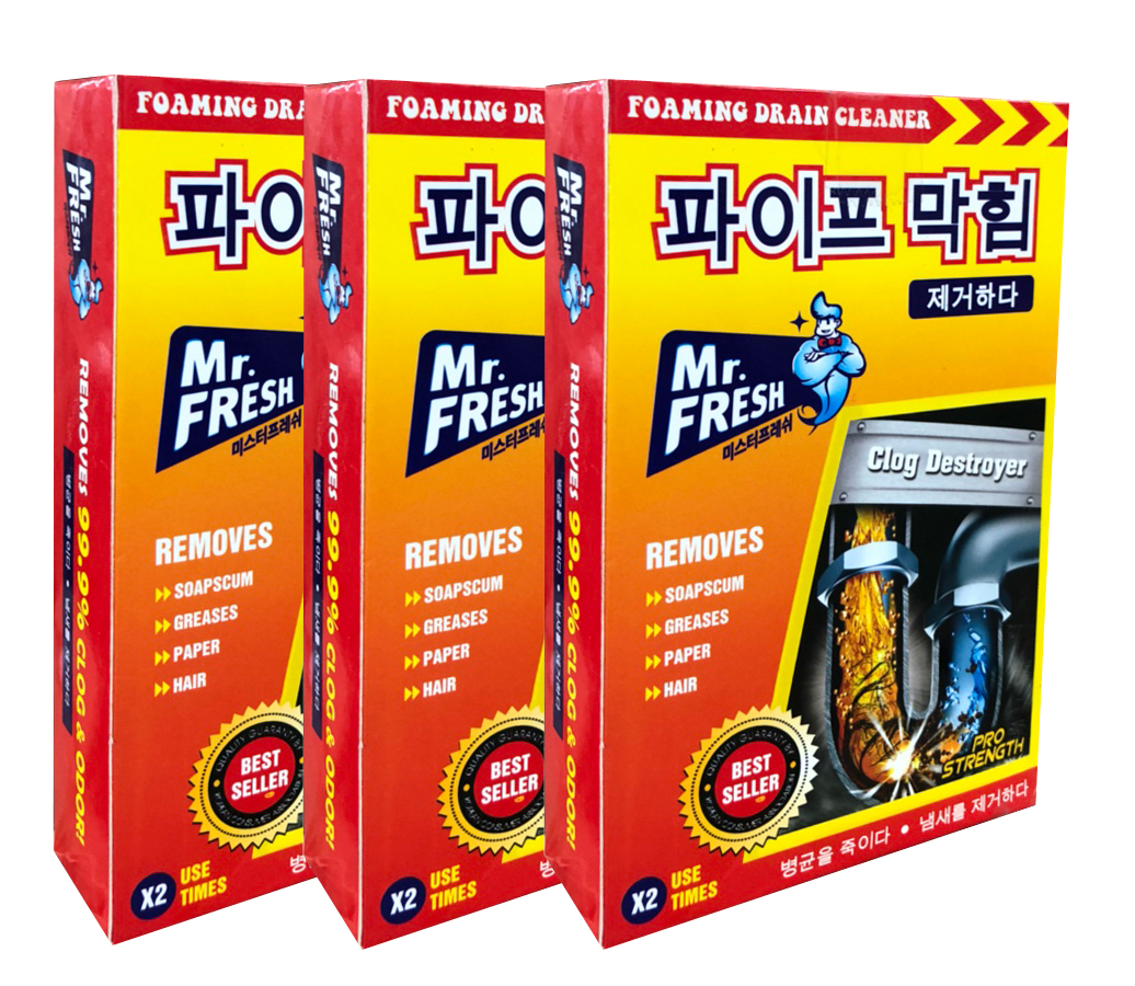 Mua tại TiktokThông Tin Sản Phẩm Tên Sản Phẩm : Hộp bột thông cống Mr Fresh Hàn Quốc 200gCông dụng : Thông tắc ống cống , ống thoát nước.Thành phần : Sodiumhydrochlorite, sdiumhydroxide, sodium silicate, hidrotrope, blodegradeble surfactant 99%Hướng dẫn sử dụng : - Cắt chéo miệng túi, đổ hạt bột vào xô nhựa, hòa tan với khoảng nửa lít nước, đổ dung dịch vào cổ ống nơi bị tắc nghẽnĐể từ 1 – 3 giờ rồi xả mạnh nước cho chảy đi (tốt nhất là đổ buổi tối, để tới sáng hôm sau mới xả mạnh nước hoặc dùng thụt cao su thụt cho chảy đi).Kích thước : 14,6 x 9,7 x 3,2 cmTrọng lượng : 200gHình thức đóng gói : 2 gói 100g/hộpMàu sắc : Hộp Đỏ (gói bên trong màu bạc)Xuất xứ : Mr Fresh - Hàn Quốc Bột thông tắc đường ống thoát nước Mr.Fresh Hàn Quốc là một trong những sản phẩm tốt nhất được bán chạy ở Hàn Quốc với công thức tiên tiến, các thành phần hóa học chuyên dụng, độ tẩy cực mạnh sẽ xoáy tan mọi cặn bẩn trong đường ống một cách hiệu quả.Sản phẩm sẽ thông sạch mọi loại cặn bẩn như giấy, rác, rau, mỡ, thịt, gạo, tóc… kẹt trong đường ống thoát nước của chậu rửa nhà bếp, lavabo, bồn tắm… mà không làm hư hại đường ống và các thiết bị vệ sinh.Bột thông tắc đường ống thoát nước Mr.Fresh Hàn Quốc trong thành phần của nó luôn có các hỗn hợp hóa học có độ kiềm, độ ăn mòn, độ phân hủy cực cao, giúp phân hủy các hợp chất hữu cơ, chất cặn bã có trong đường ống gây tắc nghẽn. ƯU ĐIỂM NỔI BẬT CỦA BỘT THÔNG TẮC VỆ SINH THÔNG CỐNG HÀN QUỐC MR.FRESH : – Sử dụng dễ dàng– Xóa bỏ sự lo lắng tắc đường ống cống, tắc bể phốt.– Nhanh chóng và tiện lợi cho việc chăm sóc gia đình.– Phân hủy và làm mềm các chất hữu cơ gây tác nghẽn đường ống như: rêu, rác, thức ăn thừa, mỡ, cọng rau, tóc và các xác động vật– Công thức tẩy sạch vết bẩn cứng đầu nhanh chóng– Không để lại mùi khó chịu như các sản phẩm thông thường– Giúp bồn cầu và ống dẫn nước thải luôn sạch sẽ, vệ sinh HƯỚNG DẪN CÁCH SỬ DỤNG Bột thông tắc đường ống thoát nước Mr.Fresh Hàn Quốc Cắt chéo miệng túi, đổ hạt bột vào xô nhựa, hòa tan với khoảng nửa lít nước, đổ dung dịch vào cổ ống nơi bị tắc nghẽnĐể từ 1 – 3 giờ rồi xả mạnh nước cho chảy đi (tốt nhất là đổ buổi tối, để tới sáng hôm sau mới xả mạnh nước hoặc dùng thụt cao su thụt cho chảy đi)Bột thông tắc đường ống thoát nước Mr.Fresh Hàn Quốc đã và đang được sử dụng nhiều ở những đơn vị lớn như khách sạn , nhà hàng..