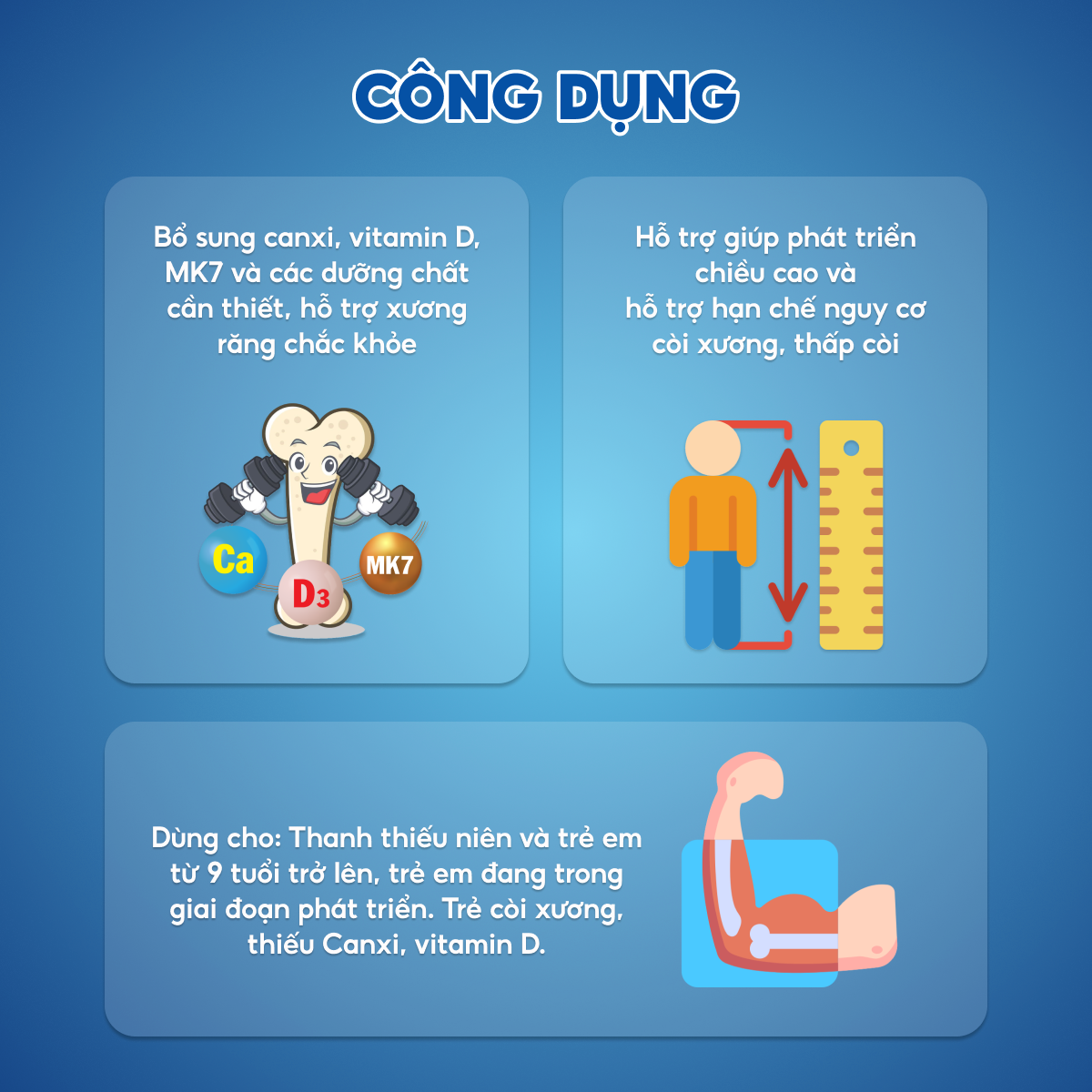 - Viên uống hỗ trợ phát triển chiều cao cho trẻ từ 9 tuổi và thanh thiếu niên giúp bổ sung canxi, vitamin D cải thiện chiều cao và xương chắc khỏe.