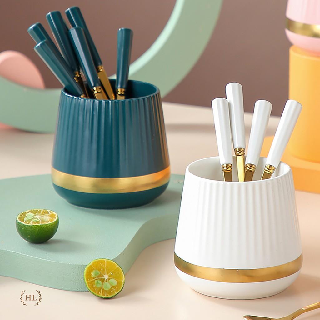 ✨Combo 6 Thìa 6 Nĩa inox hoàng kim cán sứ kèm cốc sứ đựng kẻ vàng kim cao cấp | Hũ sứ xanh trắng kẻ vàng kèm thìa nĩa sứ