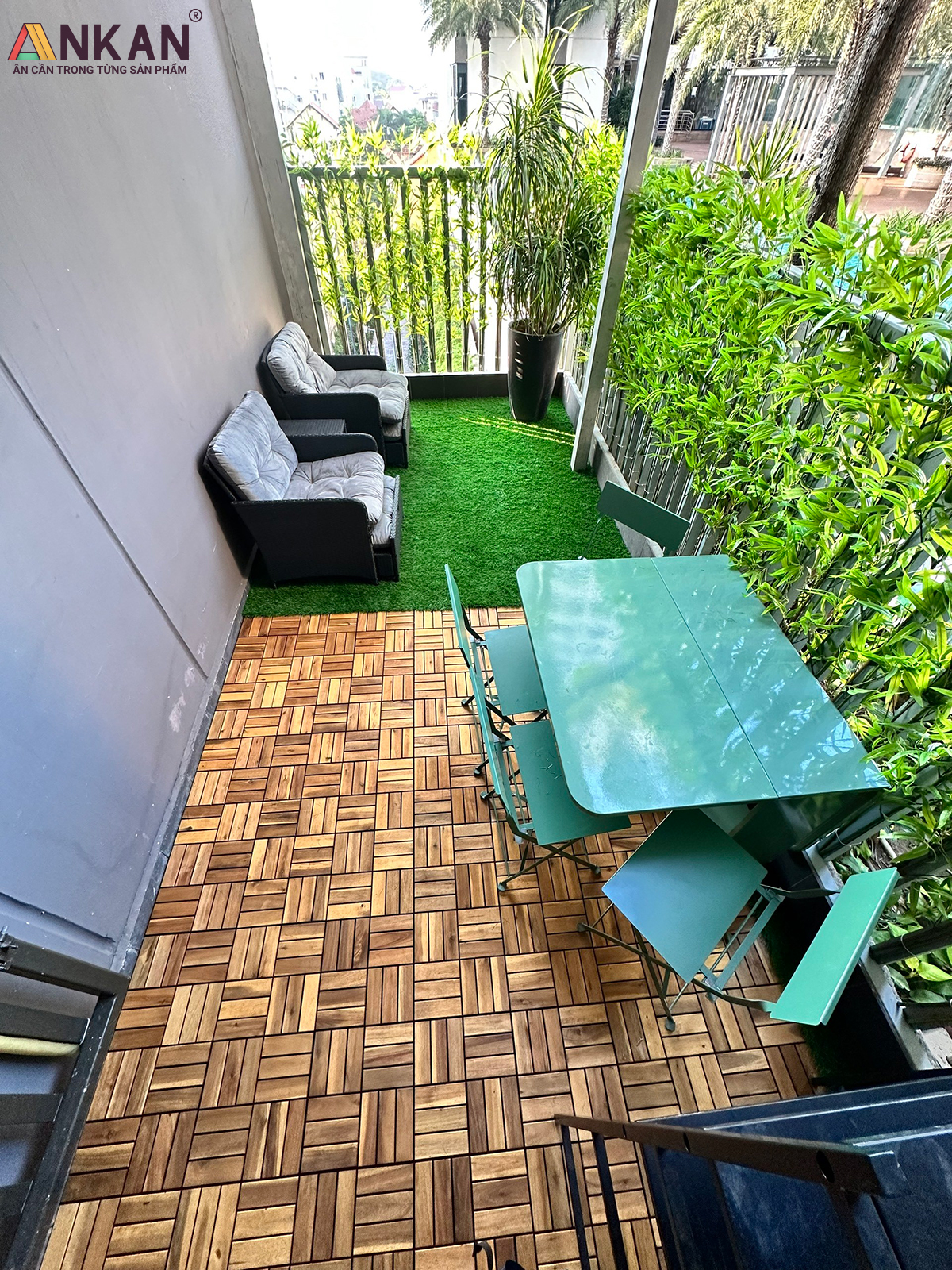 • Việc sử dụng chất liệu gỗ để lót sàn giúp đồng điệu với cây xanh, tranh trí tiểu cảnh ở ban công.