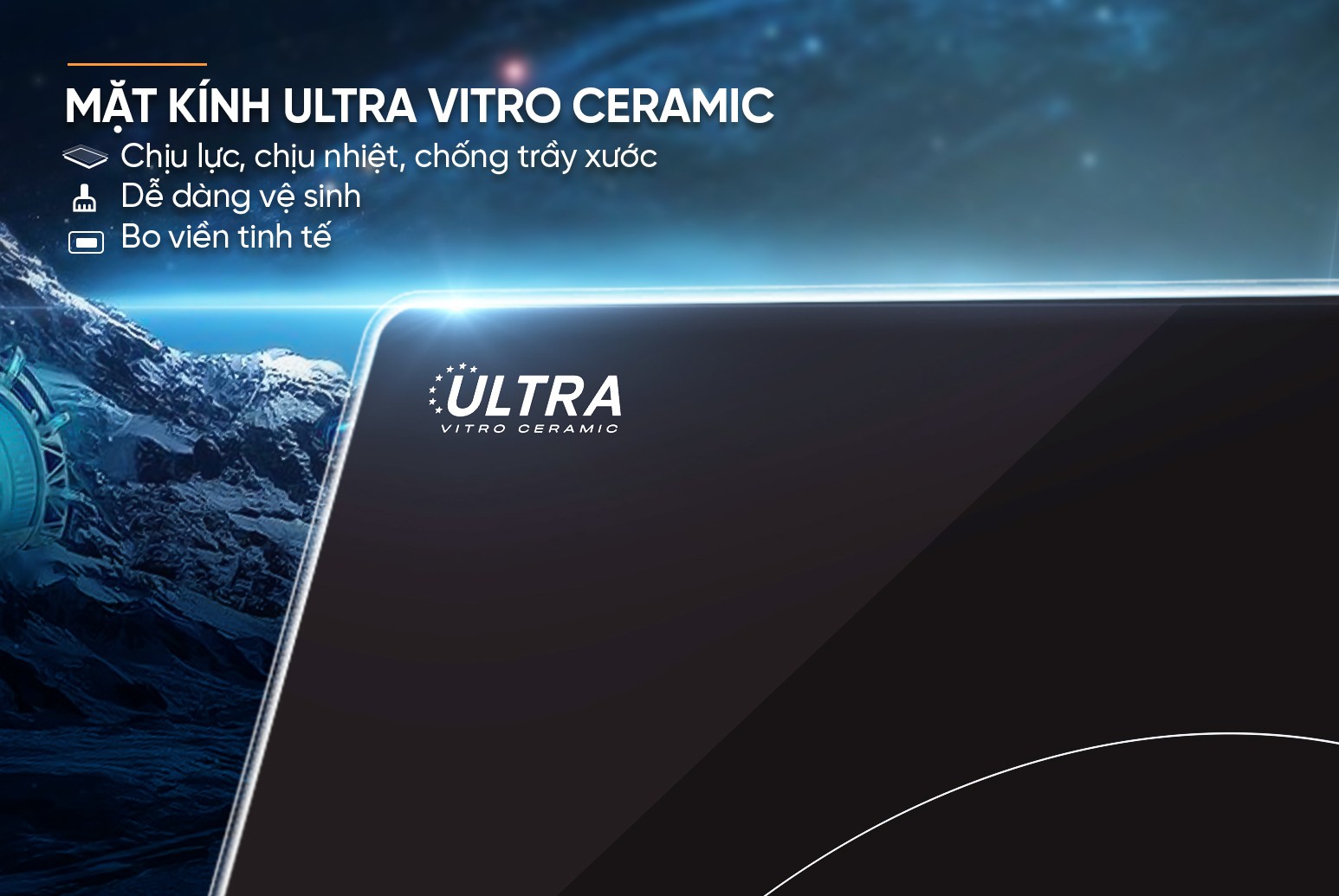 MẶT KÍNH ULTRA VITRO CERAMIC CAO CẤP Mặt kính Ultra Vitro Ceramic được chế tác từ chất liệu bền bỉ hàng đầu, giúp sản phẩm luôn sáng bóng, hạn chế trầy xước ngay cả khi sử dụng trong thời gian dài. Nhờ bề mặt kính màu đen nhẵn mịn, việc vệ sinh trở nên dễ dàng hơn bao giờ hết. Chỉ với vài thao tác nhẹ nhàng, bếp ngay lập tức trở lại sạch sẽ, sang trọng, giúp tiết kiệm thời gian, công sức cho mọi gia đình.