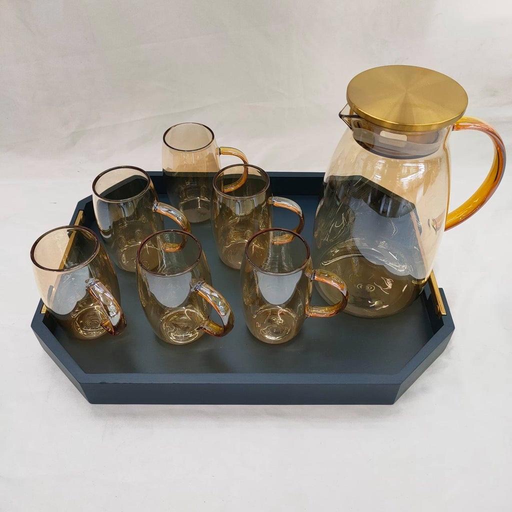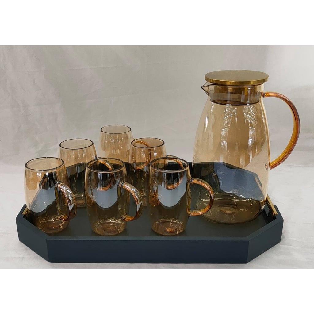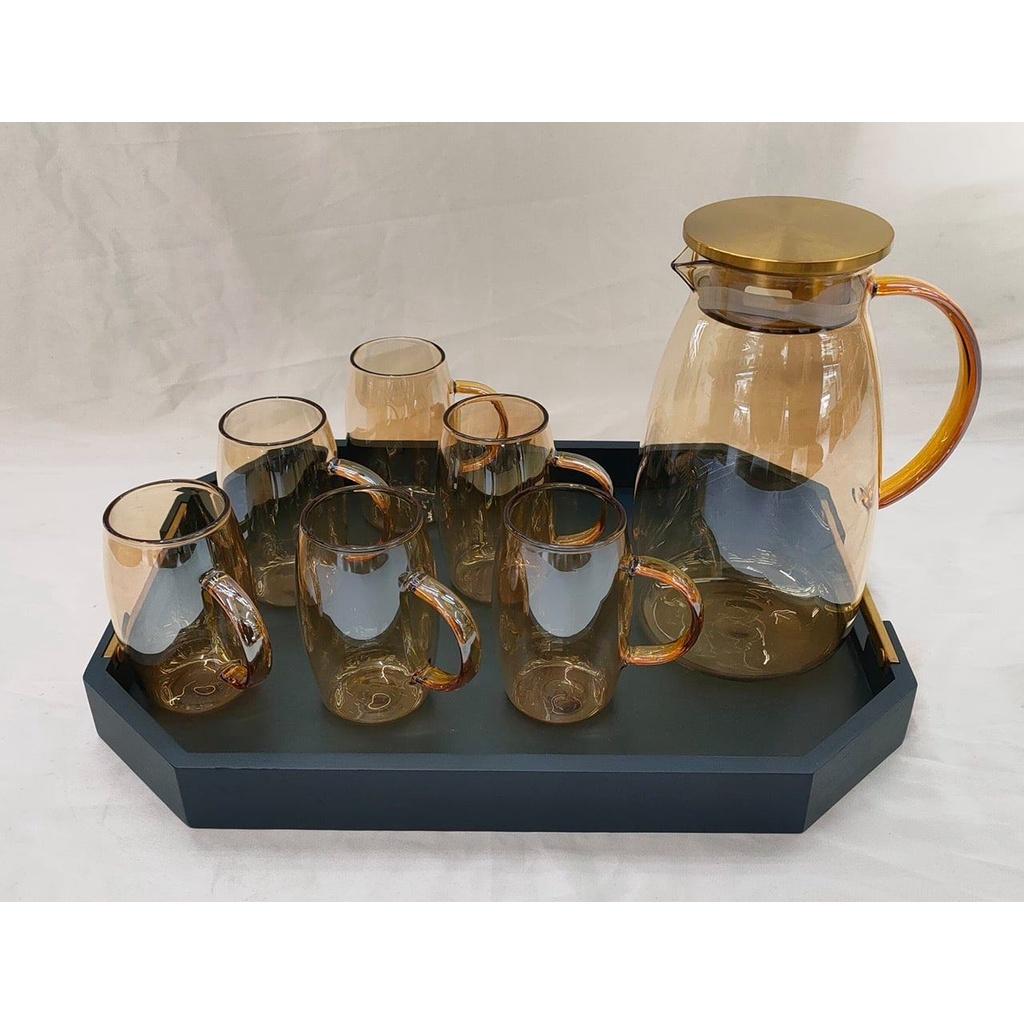 Bộ bình thuỷ tinh chịu nhiệt màu vàng gôn kèm 6 cốc phong cách Bắc Âu tạo ra một cảm giác sang trọng và vô cùng hiện đại