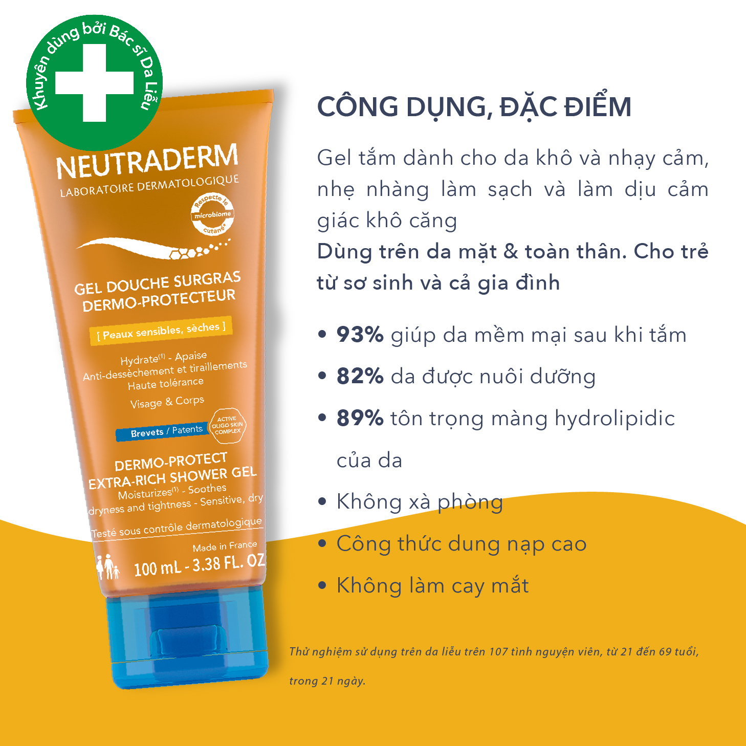 Gel Tắm Chăm Sóc Da Khô NEUTRADERM EXTRA RICH NEU Cách dùng: Đổ vài giọt vào tay và tạo bọt, nhẹ nhàng rửa sạch da mặt, da cơ thể và mái tóc của trẻ. Rửa sạch