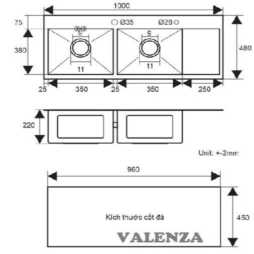 Kích thước: 1000x480x230mm Khoét lỗ: 980x460mm Chất liệu: Inox 304