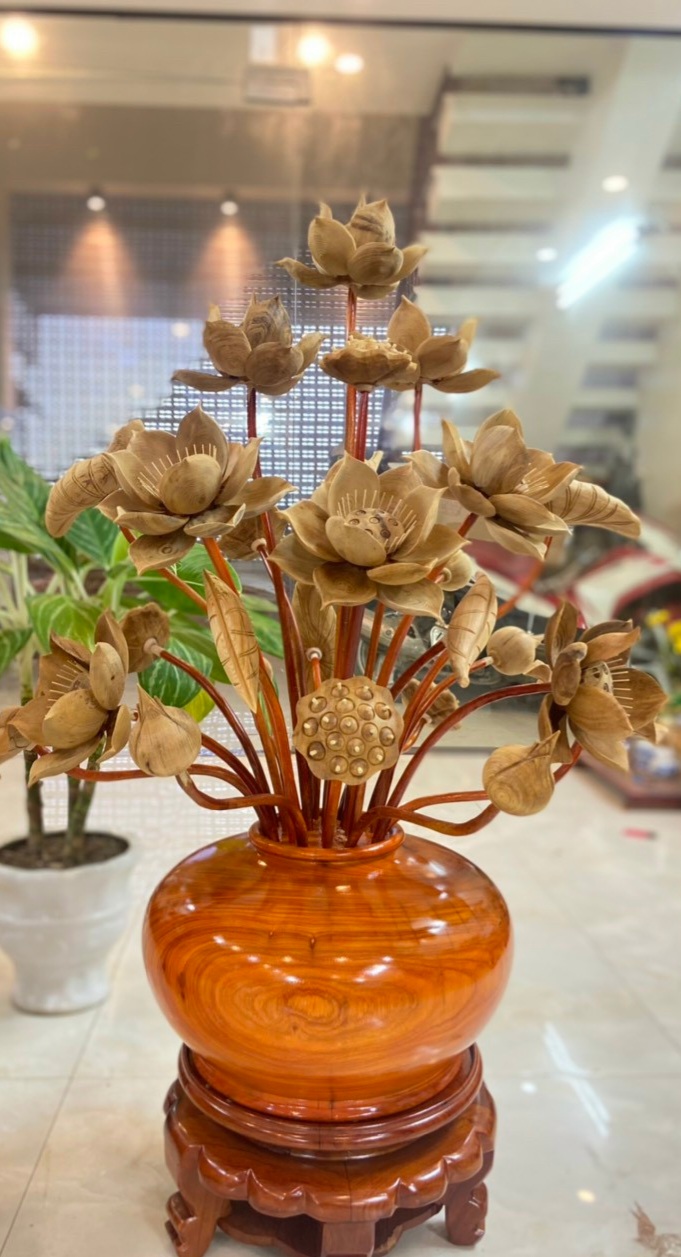 _ Bình hoa sen trang trí phòng khách ,phòng thờ được làm bằng chất liệu gỗ hương đỏ tự nhiên 100%  _ Kt bình cắm 30×25cm ,kt cao tổng kể cả  hoa lá gương 92cm