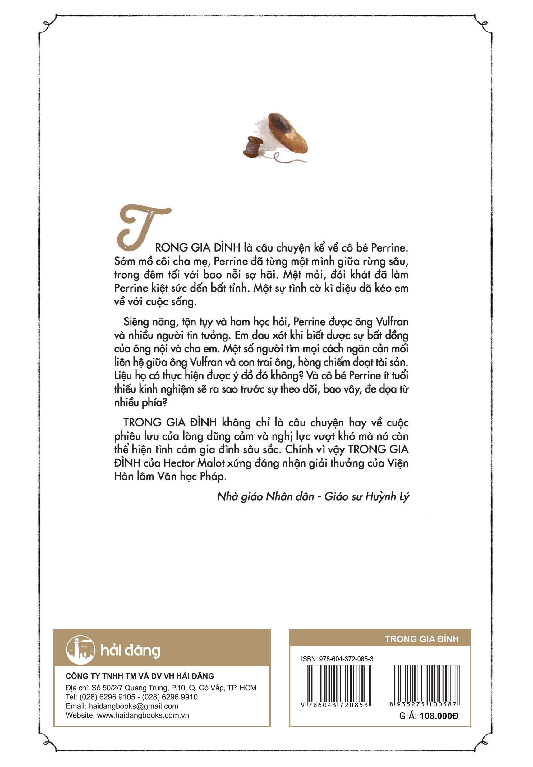 TRONG GIA ĐÌNH là câu chuyện kể về cô bé Perrine. Sớm mồ côi cha mẹ, Perrine đã từng một mình giữa rừng sâu, trong đêm tối với bao nỗi sợ hãi. Mệt mỏi, đói khát đã làm Perrine kiệt sức đến bất tỉnh. Một sự tình cờ kỳ diệu đã kéo em về với cuộc sống. Siêng năng, tận tụy và ham học hỏi, Perrine được ông Vulfran và nhiều người tin tưởng. Em đau xót khi biết được sự bất đồng của ông nội và cha em. Một số người tìm mọi cách ngăn cản mối liên hệ giữa ông Vulfran và con trai ông, hòng chiếm đoạt tài sản. Liệu họ có thực hiện được ý đồ đó không? Và cô bé Perrine ít tuổi thiếu kinh nghiệm sẽ ra sao trước sự theo dõi, bao vây, đe dọa từ nhiều phía? TRONG GIA ĐÌNH không chỉ là câu chuyện hay về cuộc phiêu lưu của lòng dũng cảm và nghị lực vượt khó mà nó còn thể hiện tình cảm gia đình sâu sắc. Chính vì vậy TRONG GIA ĐÌNH của Hector Malot xứng đáng nhận giải thưởng của Viện Hàn lâm Văn học Pháp.