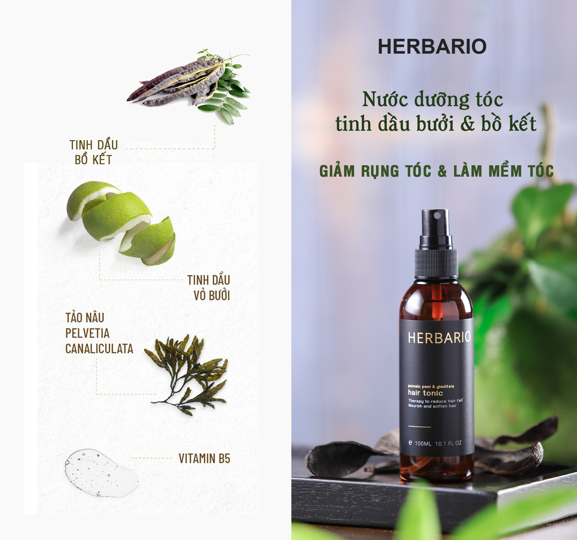 - Cung cấp dưỡng chất cho nang tóc, giúp khỏe từ thân đến ngọn Thành phần chính Nước dưỡng tóc vỏ bưởi và bồ kết Herbario