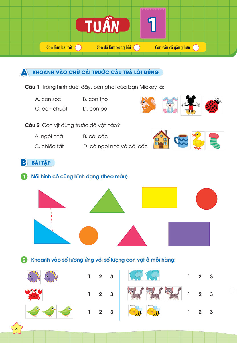 - Hệ thống các bài tập phong phú, mang tính tổng hợp và ôn luyện toàn diện. Hệ thống bài tập đa dạng, lượng phù hợp với việc học cuối tuần để các con vẫn có thời gian thư giãn và vui chơi. Đặc biệt, sau mỗi kì sẽ có bài ôn tập giữa kì và cuối kì giúp con có tài liệu ôn tập cho các kì kiểm tra.