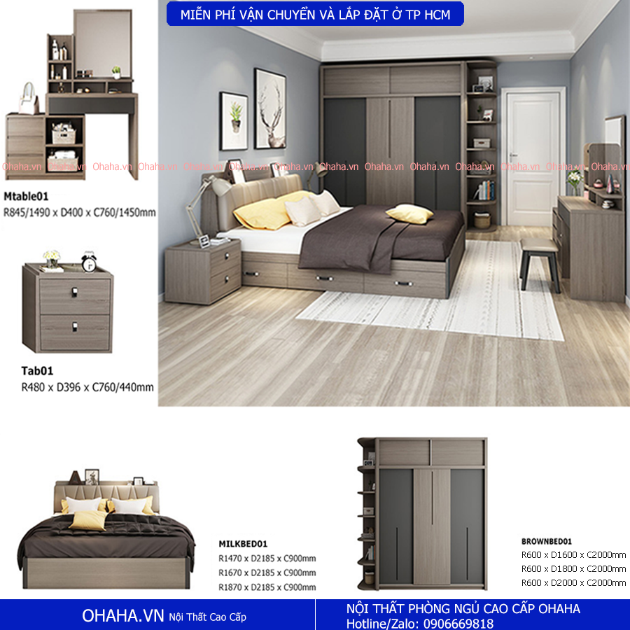 - Với chi phí phải chăng, bạn đã sở hữu bộ nội thất phòng ngủ hiện đại mà đáp ứng rất nhiều nhu cầu của mình được sản suất từ gỗ công nghiệp MDF cùng phụ kiện cao cấp. Hơn nữa, bạn sẽ hoàn toàn yên tâm sử dụng với chính sách bảo hành 2 năm chính hãng từ công ty. Lưu ý: Combo Phòng Ngủ Cao Cấp Xám Khói Ohaha được giao lắp miễn phí tại TP HCM, các tỉnh thành khác xin liên hệ qua shop để biết chi phí vận chuyển và lắp đặt. Combo Phòng Ngủ Cao Cấp Xám Khói Ohaha chưa bao gồm các vật dụng trang trí và bộ chăn-ga-gối-nệm.