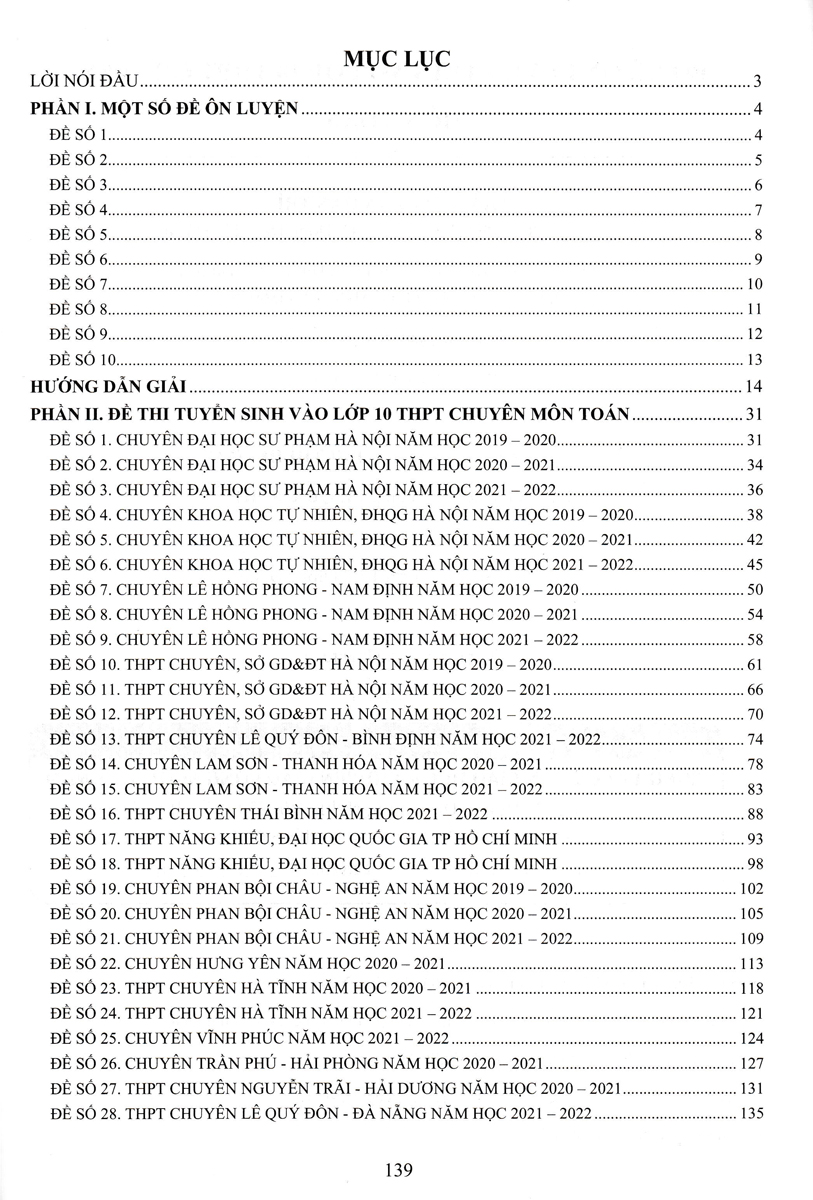 Phần I. Một số đề ôn luyện. Phần này gồm 10 đề thi được biên soạn công phu, bám sát định dạng đề thi vào lớp 10 THPT chuyên môn Toán của các tỉnh, thành phố và hướng dẫn giải chi tiết.