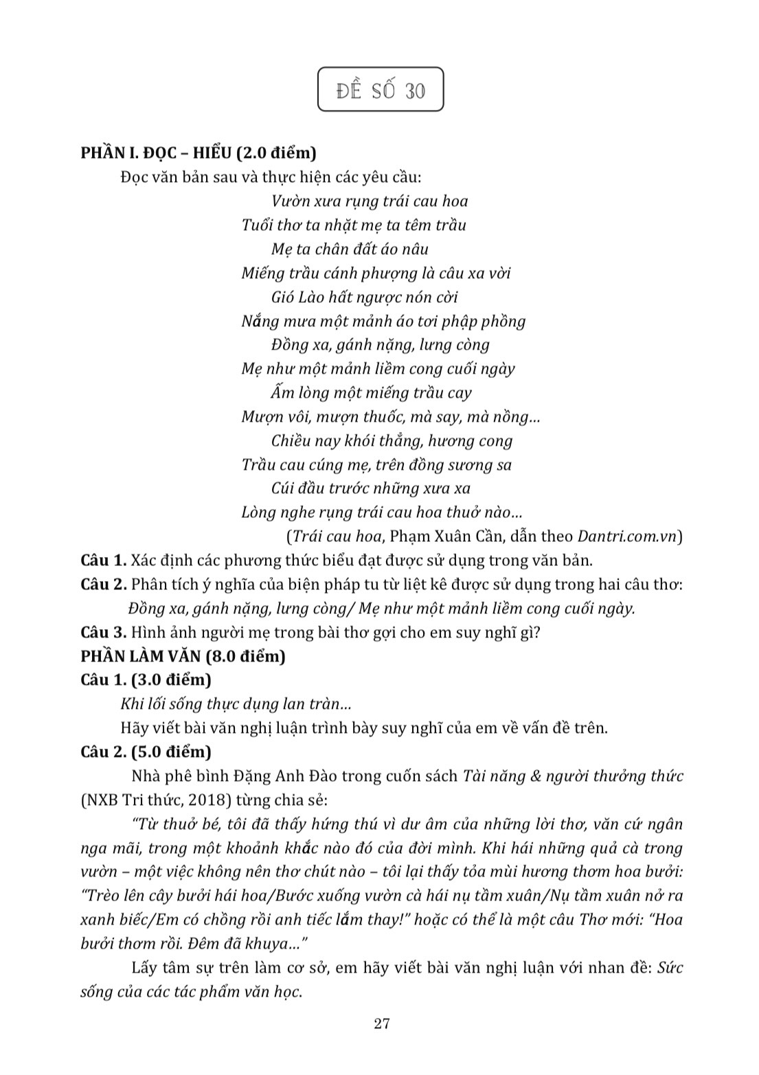 Phần 1: Đề ôn luyện. Phần này bao gồm 30 đề thi được biên soạn công phu, bám sát định dạng đề thi vào lớp 10 THPT chuyên môn Ngữ văn của các tỉnh, thành phố trên cả nước.