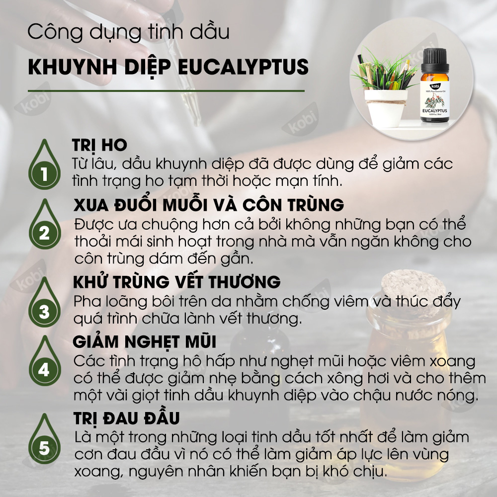 Được chiết xuất từ 100% lá khuynh diệp tự nhiên có tác dụng chống nhiễm trùng, chống thấp khớp,giảm chuột rút, lợi tiể