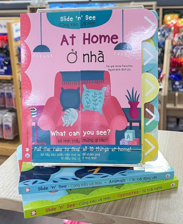 Bộ sách ""Slide and see"" cho bé tương tác trực tiếp kéo phần tấm thẻ ra để khám phá bí mật đằng sau mỗi trang sách. Mỗi cuốn sách được sáng tạo dựa trên một chủ đề và bao gồm các từ vựng Tiếng Anh cho bé vừa chơi vừa học: