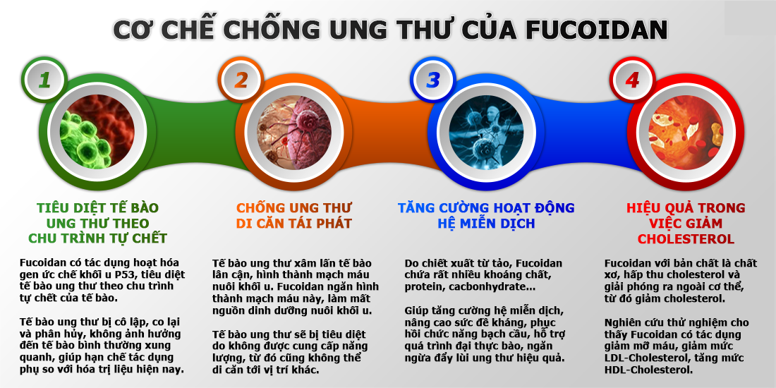 Fucoidan có tác dụng kích hoạt quá trình tự chết của tế bào ung thư, đồng thời bao vây lại tế bào ung thư khiến chúng không thể di căn qua khu vực khác. Điều này tạo điều kiện thuận lợi cho việc can thiệp bằng các phương pháp khác.