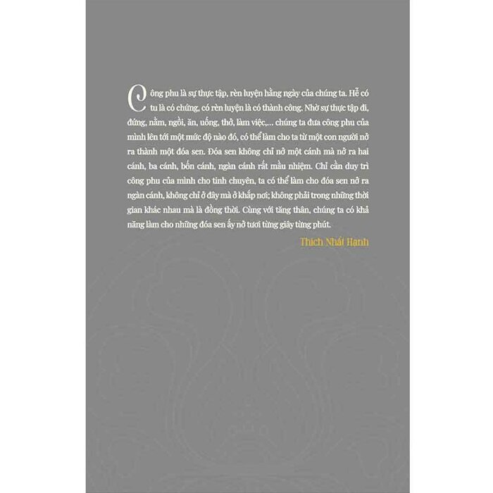 “Công phu là sự thực tập, sự rèn luyện hằng ngày của chúng ta. Hễ có tu là có chứng, có rèn luyện là có thành công. Nhờ sự thực tập đi, đứng, nằm, ngồi, ăn, uống, thở, làm việc,… chúng ta đưa công phu của mình lên tới một mức độ nào đó, có thể làm cho ta từ một con người nở ra thành một đóa sen. Đóa sen không chỉ nở một cánh mà nở ra hai cánh, ba cánh, bốn cánh, ngàn cánh rất mầu nhiệm. Chỉ cần duy trì công phu của mình cho tinh chuyên, ta có thể làm cho đóa sen nở ra ngàn cánh, không chỉ ở đây mà ở khắp nơi; không phải trong những thời gian khác nhau mà là đồng thời. Cùng với tăng thân, chúng ta có khả năng làm cho những đóa sen ấy nở tươi từng giây từng phút.” (Thích Nhất Hạnh)